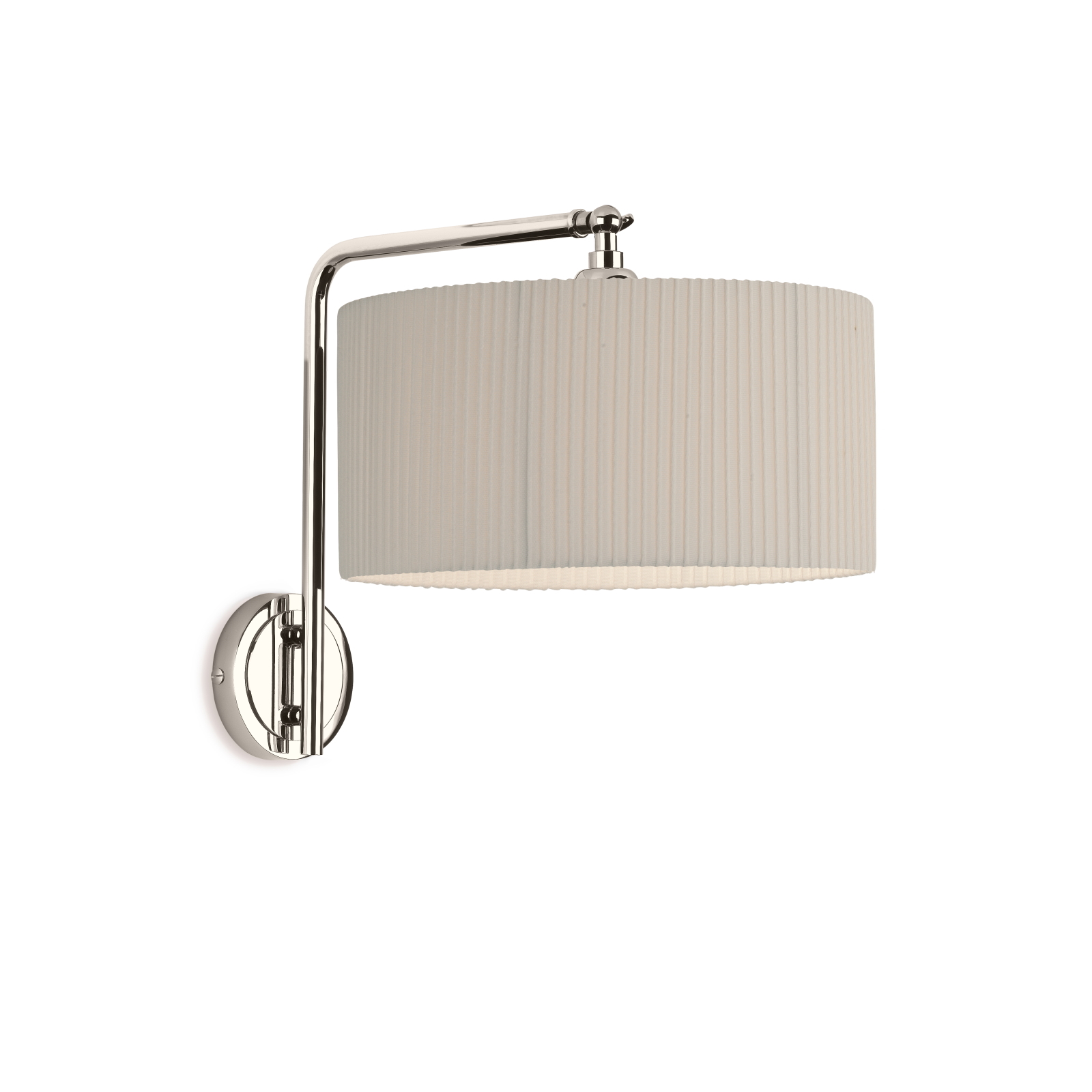 Questo modello di applique, che si estende delicatamente dalla parete con paralume regolabile, rappresenta una soluzione moderna ed elegante per qualsiasi interno. Disponibile in finitura cromo, nichel e oro chiaro.