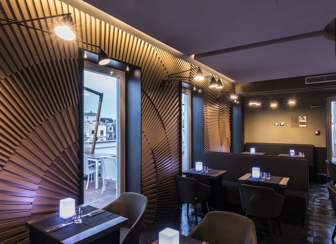 Decorata da paralumi in metallo verniciati bicolore. Perfetta per ampi spazi interni e zone comuni.