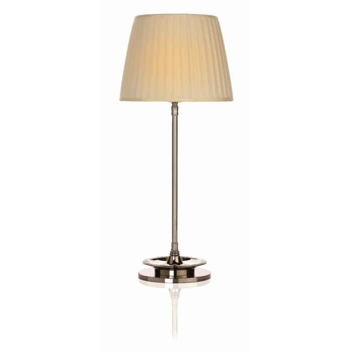 Concepita con una finitura nichel lucido e un paralume conico in tessuto plissettato avorio, capaci di donare a questo pezzo un sentimento classico e senza tempo. Disponibile anche in finiture cromo e oro chiaro.