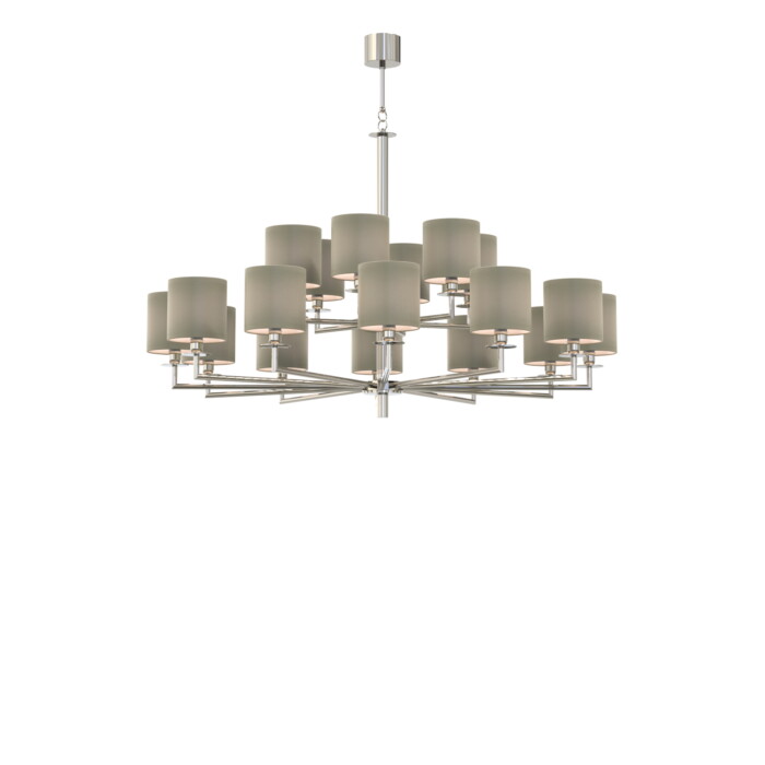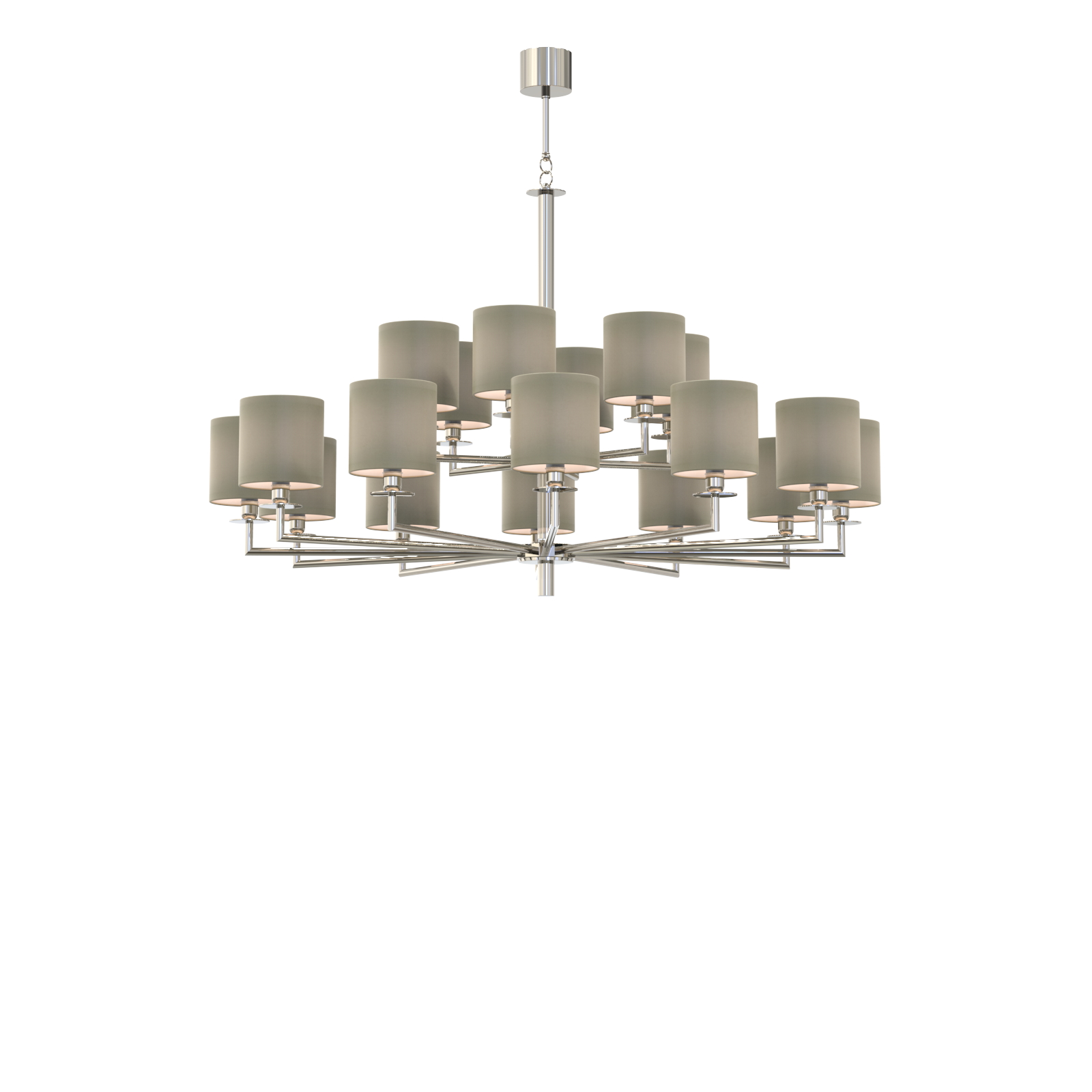 Ispirato a un design classico e ricercato, questo lampadario ideale per saloni e zone giorno è un chiaro esempio di estetica e funzionalità applicativa. Composto da una struttura e da 18 bracci in ottone in finitura nichel lucido, sormontati da altrettanti paralumi cilindrici in tessuto avorio.
