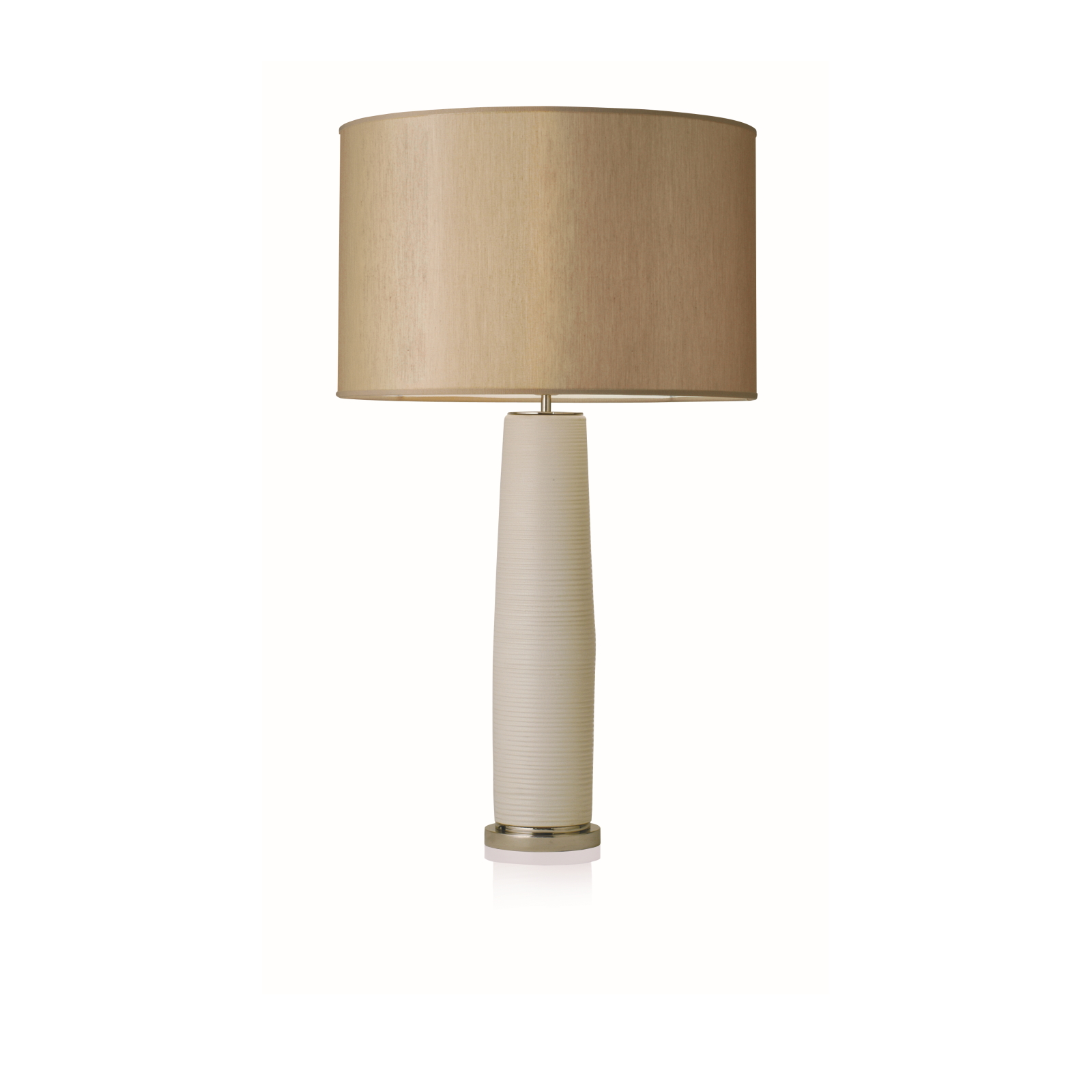 Raffinate e fonti di luce confortevole e accogliente, sono perfette per essere abbinate all’interno di camere e zone comuni. Questo specifico modello presenta un corpo in ceramica decorata e base tonda in ottone cromato, con paralume cilindrico in tessuto avorio.