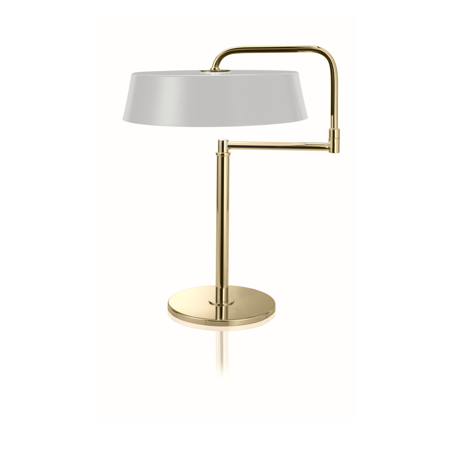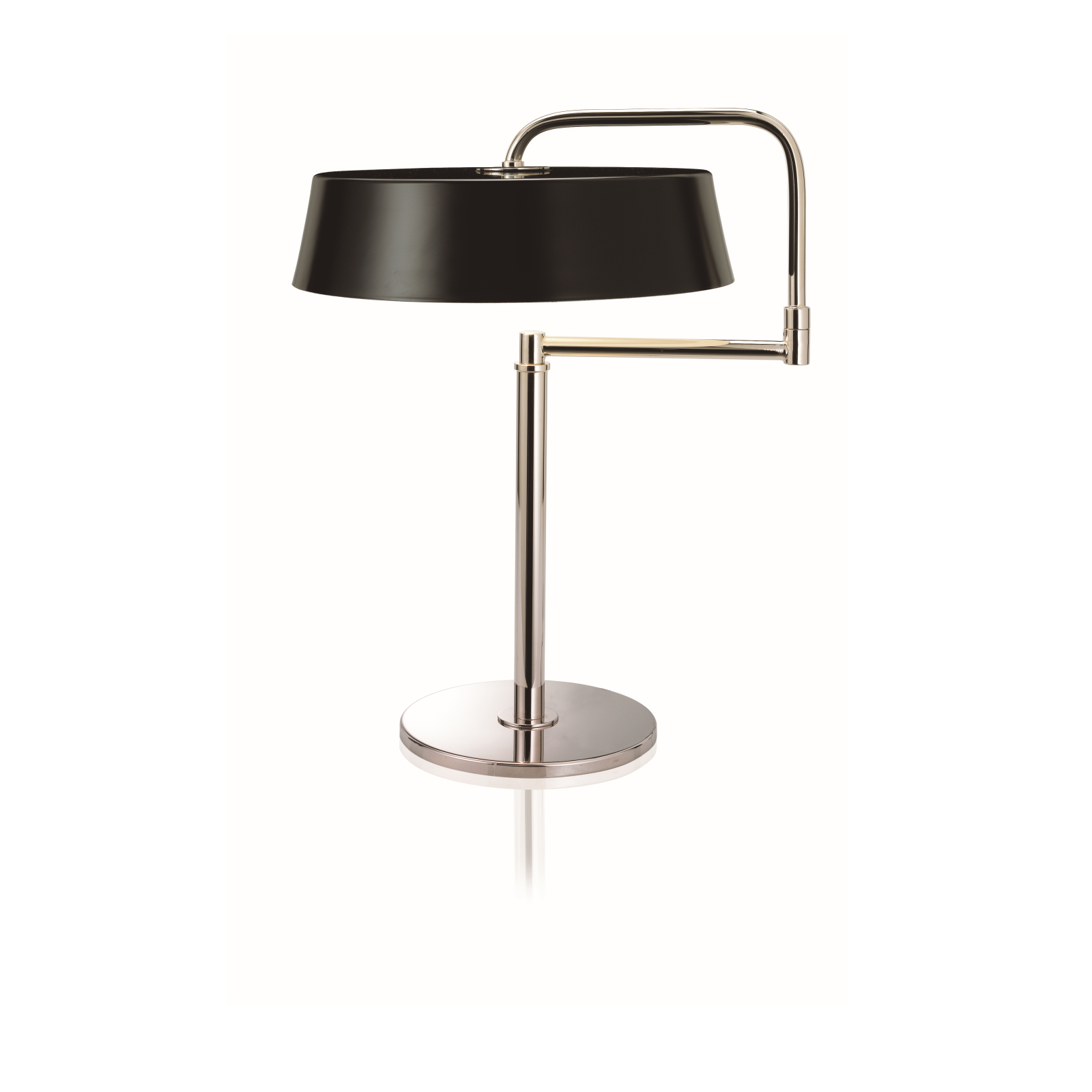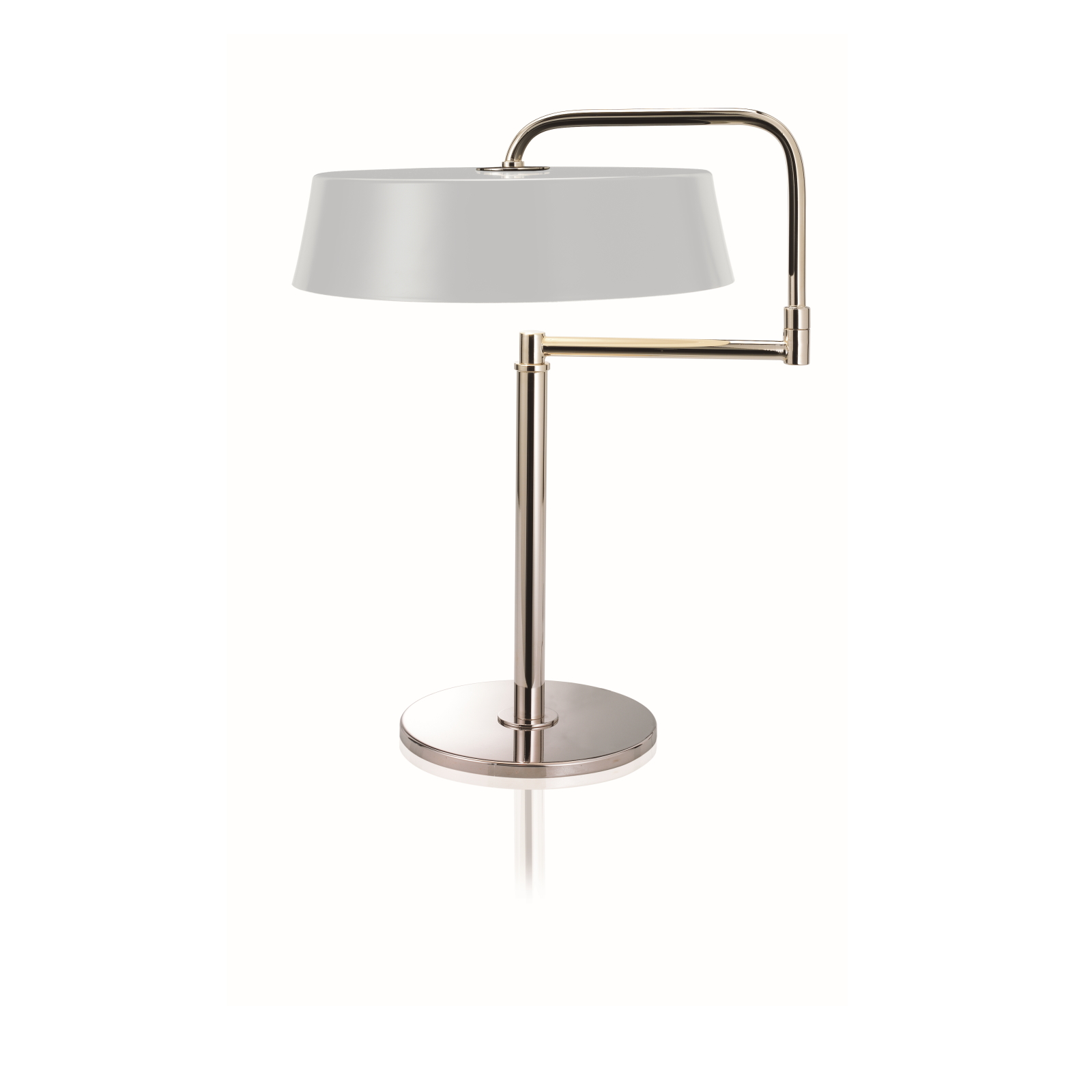 Questa lampada da tavolo orientabile in ottone finitura cromo, presenta come paralume una calotta circolare a tronco di cono in metallo verniciato bicolore. Disponibile in vari colori.