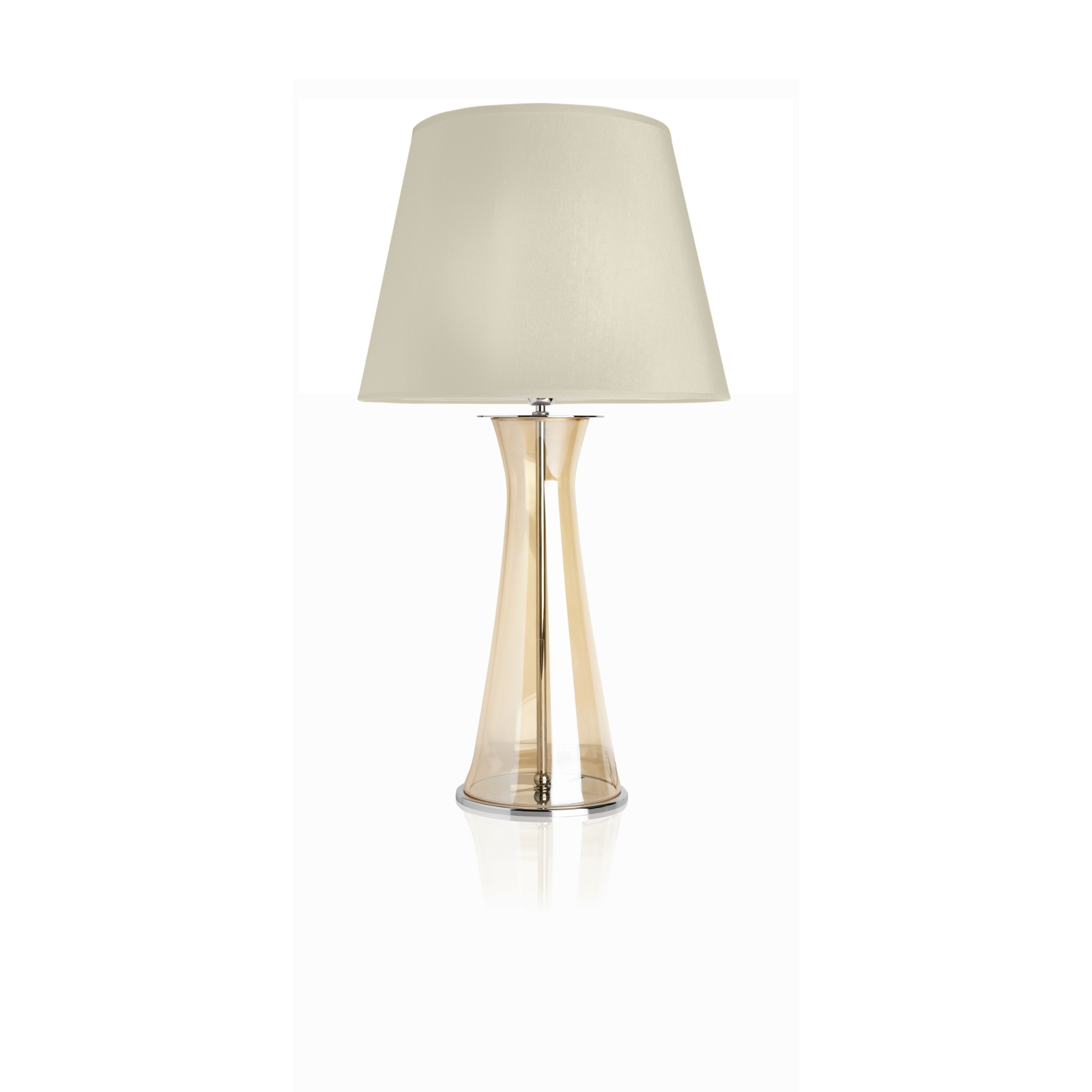 Contemporanea lampada da tavolo, comodino o scrivania dal design innovativo, con struttura in vetro colorato e particolari in finitura cromo.