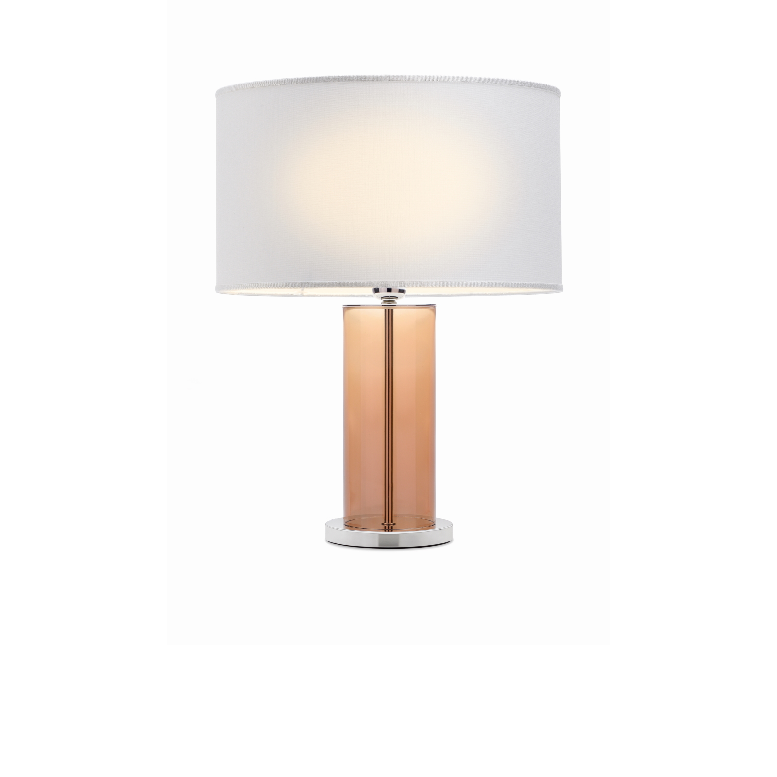 Contemporanea lampada da tavolo in vetro decorato, disponibile in vari colori, dal design originale di forma cilindrica e struttura in ottone in finitura nichel lucido.