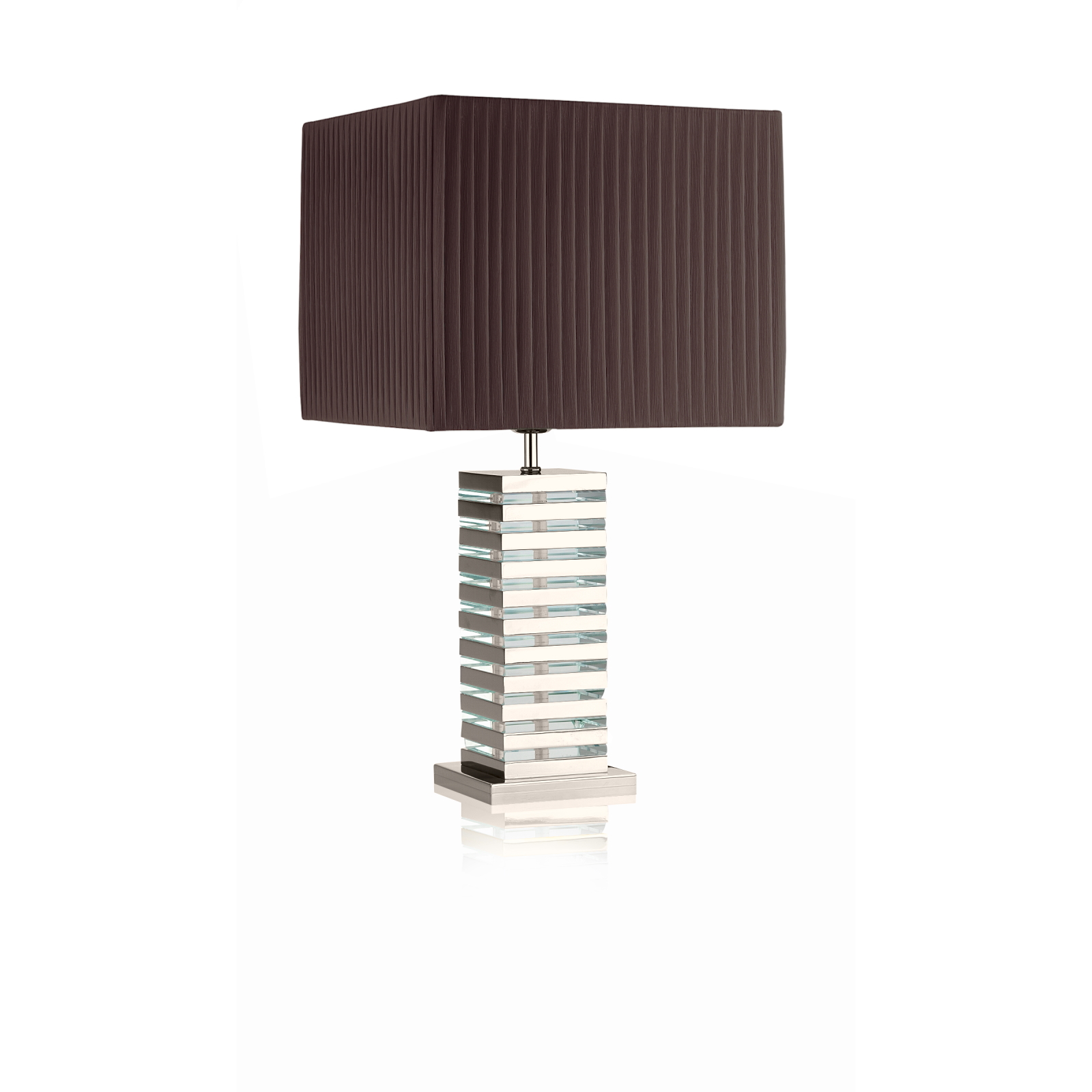 Contraddistinta da un design originale e senza tempo, questa lampada da tavolo o da scrittoio in metallo finitura cromo unisce stile e modernità attraverso particolari in metacrilato trasparente e un paralume in tessuto plissettato marrone di forma rettangolare. Disponibile in finitura nichel lucido, cromo lucido e oro chiaro lucido.