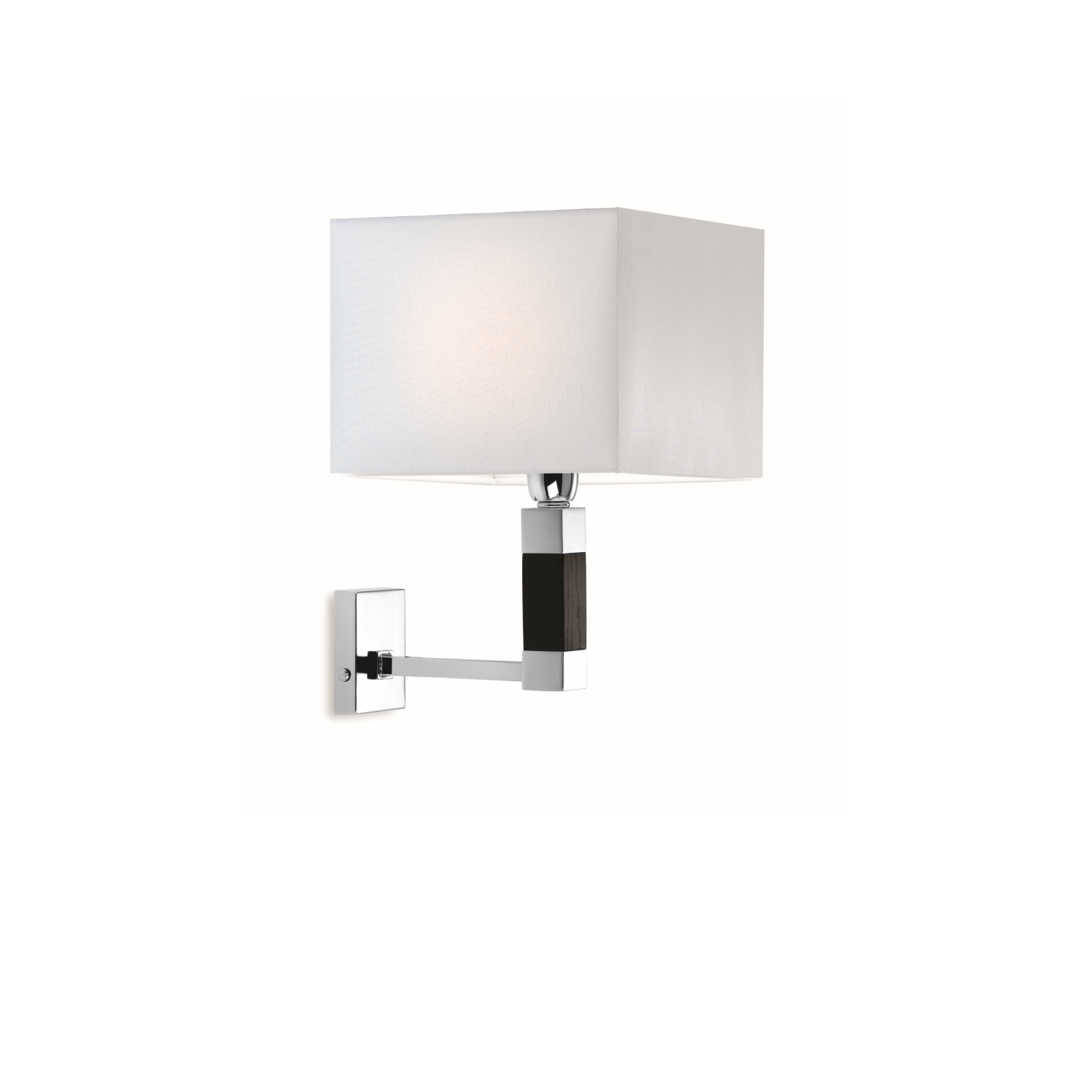Costituita da una struttura in ottone con finitura nichel lucido e arricchita da particolari in legno colore wengé, questa lampada da parete per camere, corridoi e zone comuni è completata da un paralume quadrato in tessuto bianco.