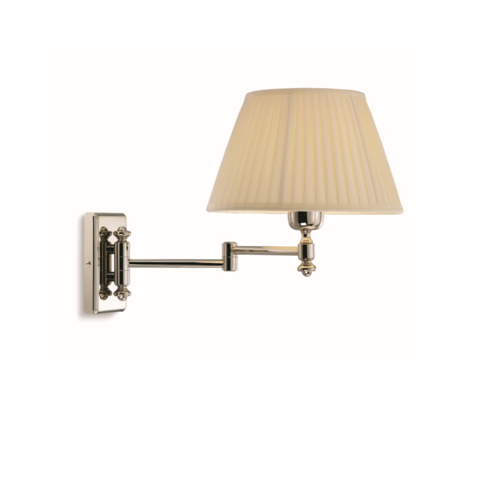 Questo modello da parete, è composto da un braccio regolabile con doppio snodo e base a muro rettangolare in ottone, finitura nichel lucido, completato da un paralume di forma troncoconica in tessuto plissettato avorio.