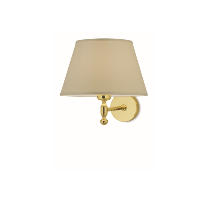 La struttura, comprensiva di una base tonda e un braccio ad angolo retto e definita da linee morbidi e delicate, è stata realizzata in ottone finitura lucido. Completa l’articolo un paralume a forma di tronco di cono in tessuto color sabbia.