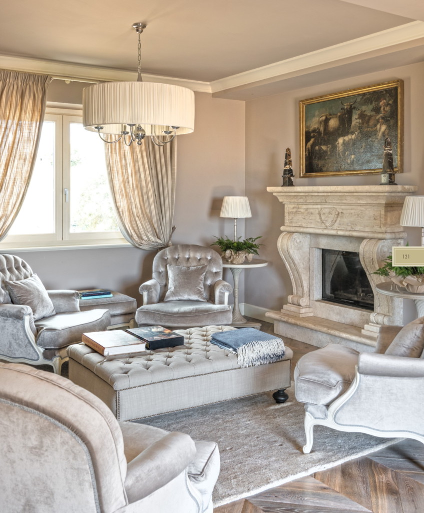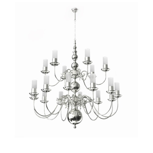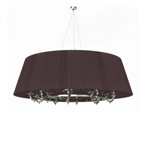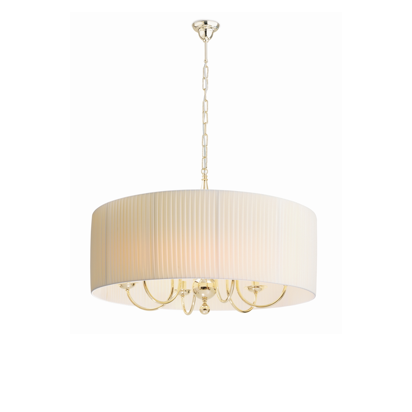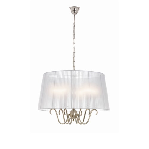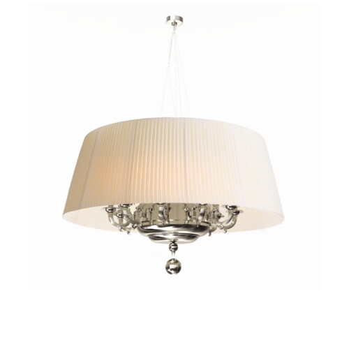 Questo particolare modello si presenta con 6 punti luce e un paralume cilindrico in tessuto plissettato avorio, con struttura in ottone finitura nichel lucido. Disponibile in varie finiture.