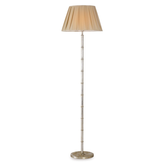The design is characterized by a round base and a linear stem, which cyclically presents small rings equidistant from each other, all made of brass and decorated in silver leaf. This floor model is completed by a conical lampshade in ivory pleated fabric.