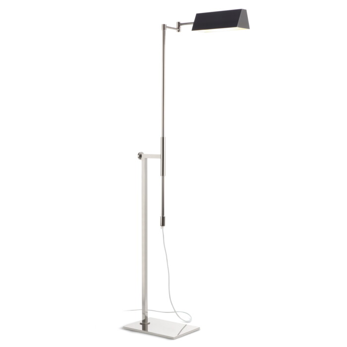 Extendable floor lamp in brass with polished nickel finish with rectangular base. Composed of an articulated structure, capable of giving dynamism and uniqueness to the reading area of the hall or bedroom, combining elegant lines with an innovative design.