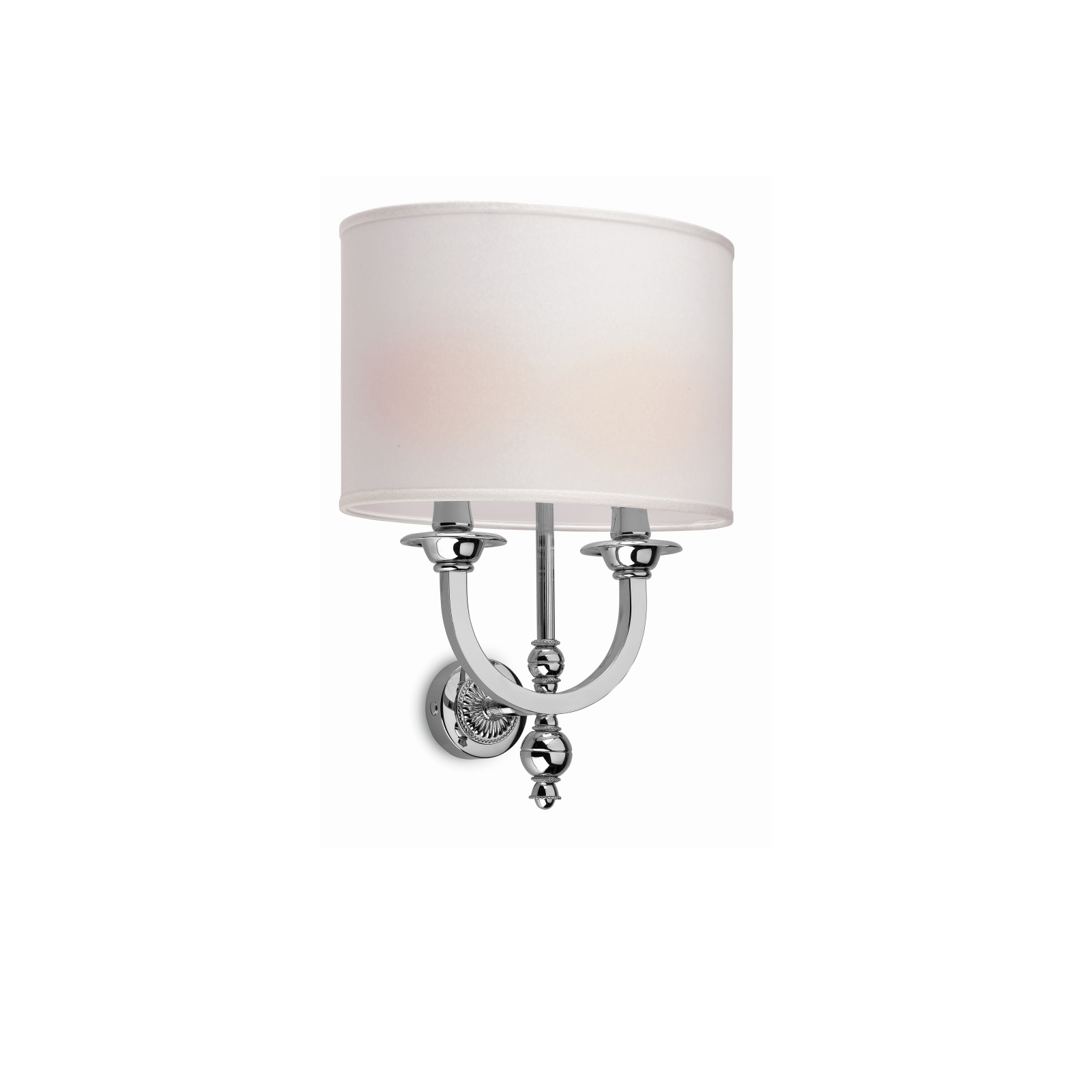 The luminaires of the Andromeda series are composed of a brass structure with a polished nickel finish and an oval lampshade in white fabric. A vertical rod meets the center of a semicircle on which the two light points rest.