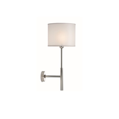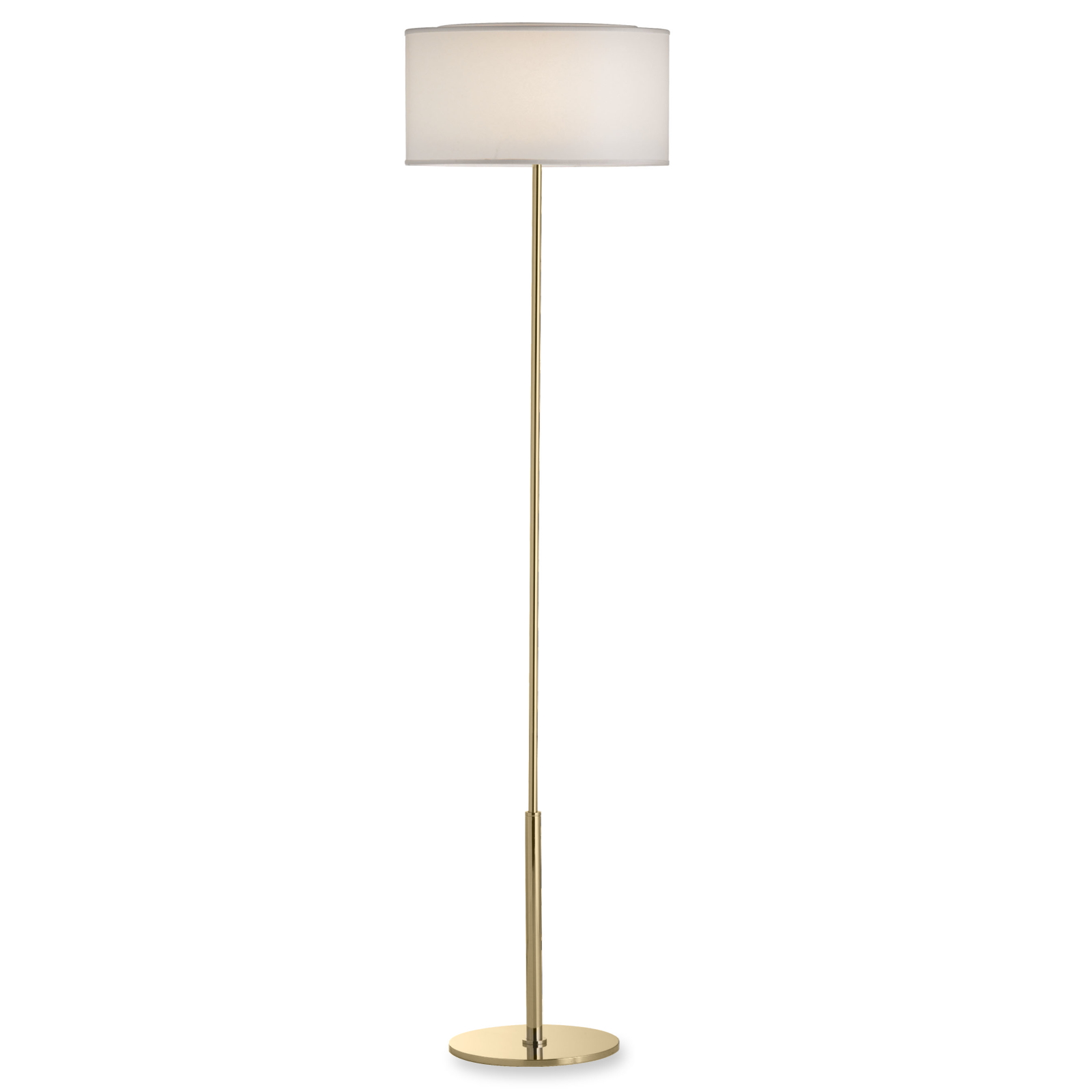 Composed of a structure and round base in brass, polished nickel finish and a cylindrical lampshade in white fabric.