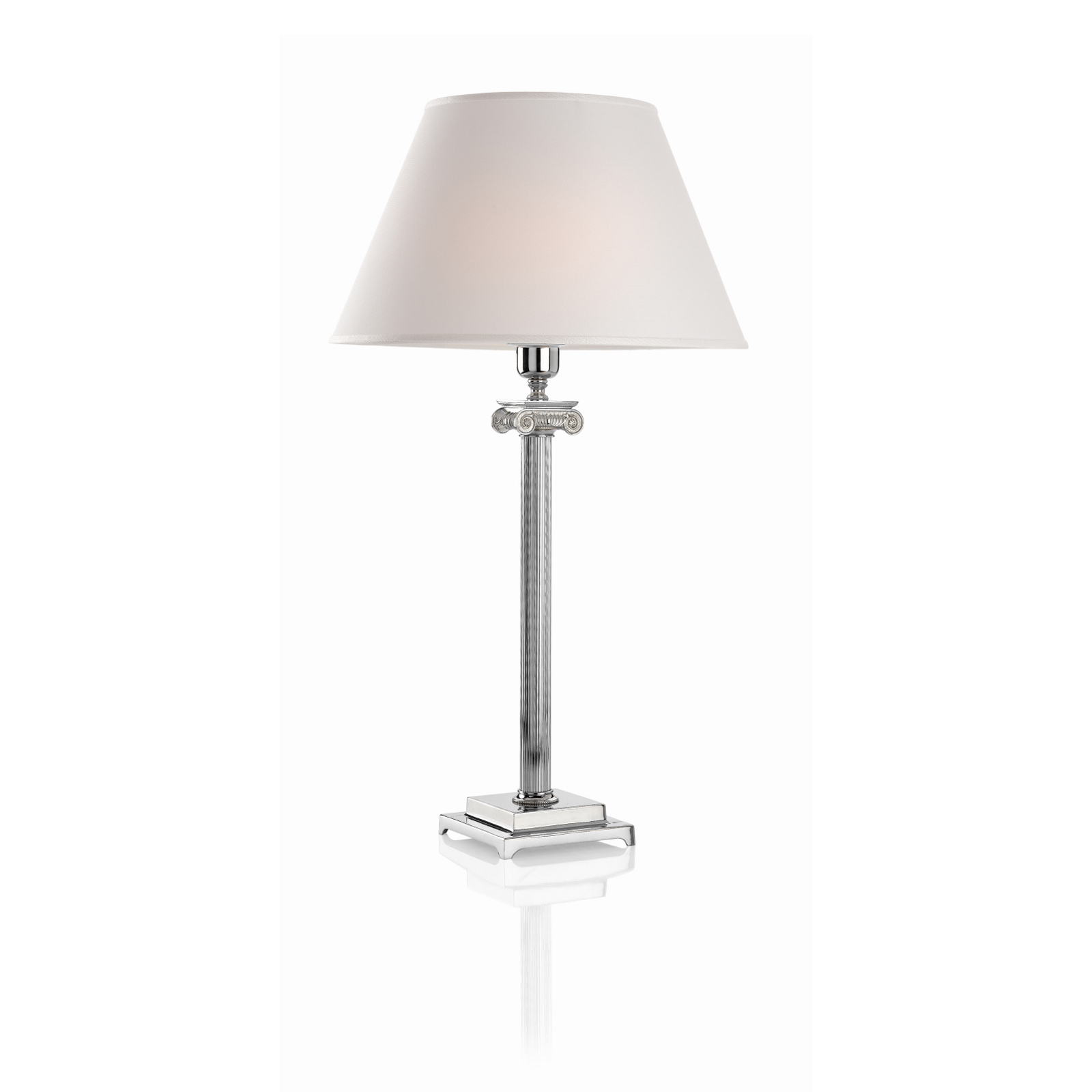 The small decorative details with a strong artistic connotation define this table or bedside lamp, consisting of a structure in cast brass with a polished nickel finish and a conical-shaped lampshade in white fabric.