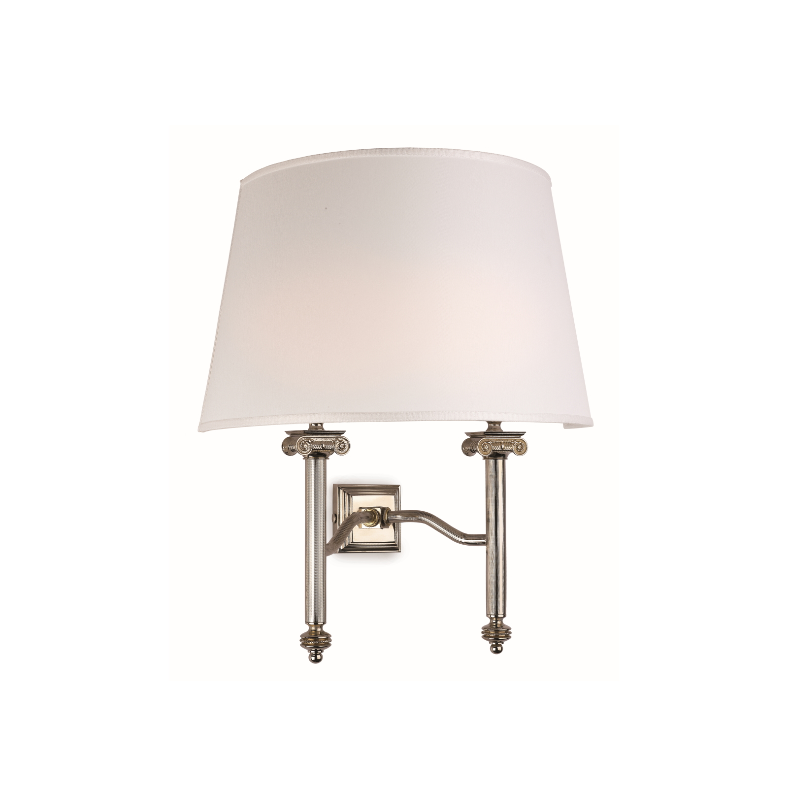 The small decorative details with a strong artistic connotation define this wall lamp with two light points, consisting of a structure in cast brass with a polished nickel finish and a conical-shaped lampshade in white fabric.