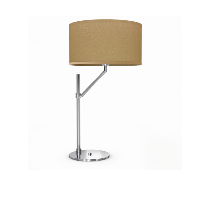 Presented with a cylindrical lampshade in hazelnut colour fabric and a structure in chrome finish, this luminaire suitable also for desks and bedside tables finds its essence in its modern simplicity.