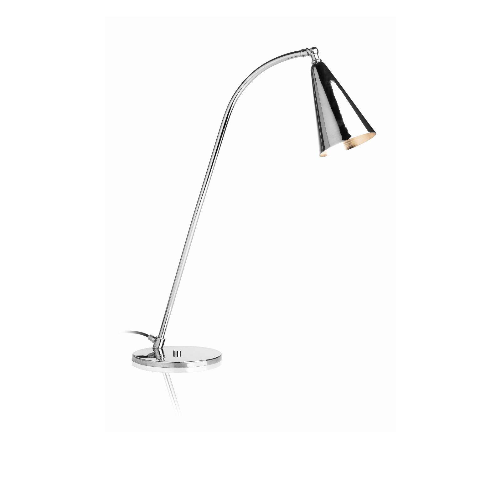 Consisting of a round base, a dynamic hood and a lampshade, all made entirely of chrome-finish metal and available in other colors.