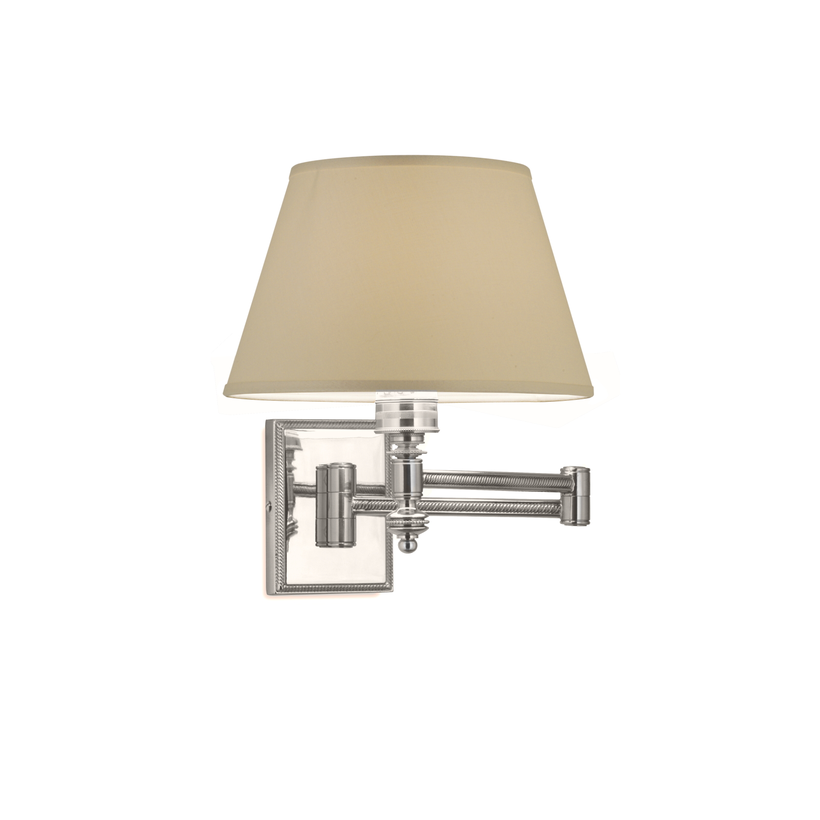 Equipped with double joint in brass, bright light gold finish and conical lampshade in ivory fabric. Available in different finishes.