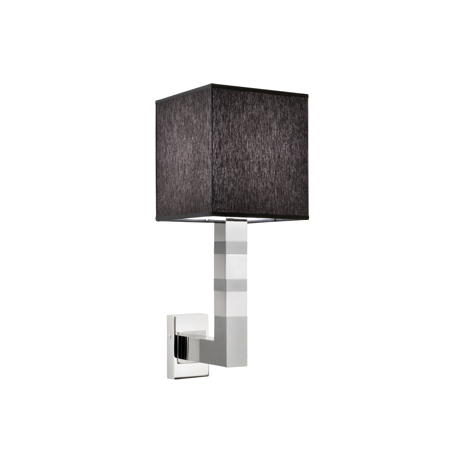 Born from the idea of creating an environment with a strong visual impact, this wall lamp is offered in a chrome finish, with a square-shaped lampshade in black fabric.