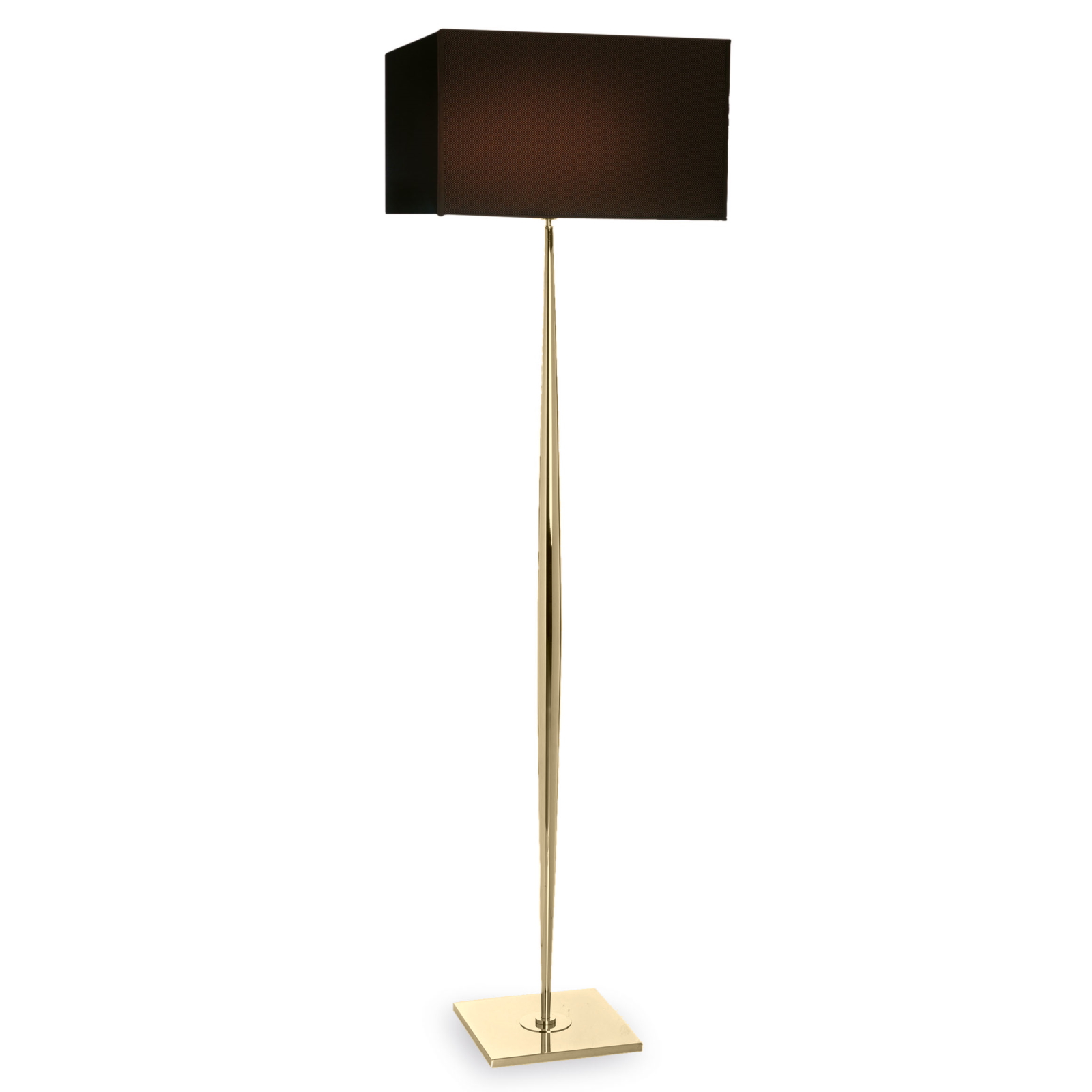 Chrome-finish metal floor lamp with a peculiarly shaped stem: a sturdy rod characterized by a diameter that tapers progressively at both ends connects the square base to a rectangular lampshade in brown fabric.