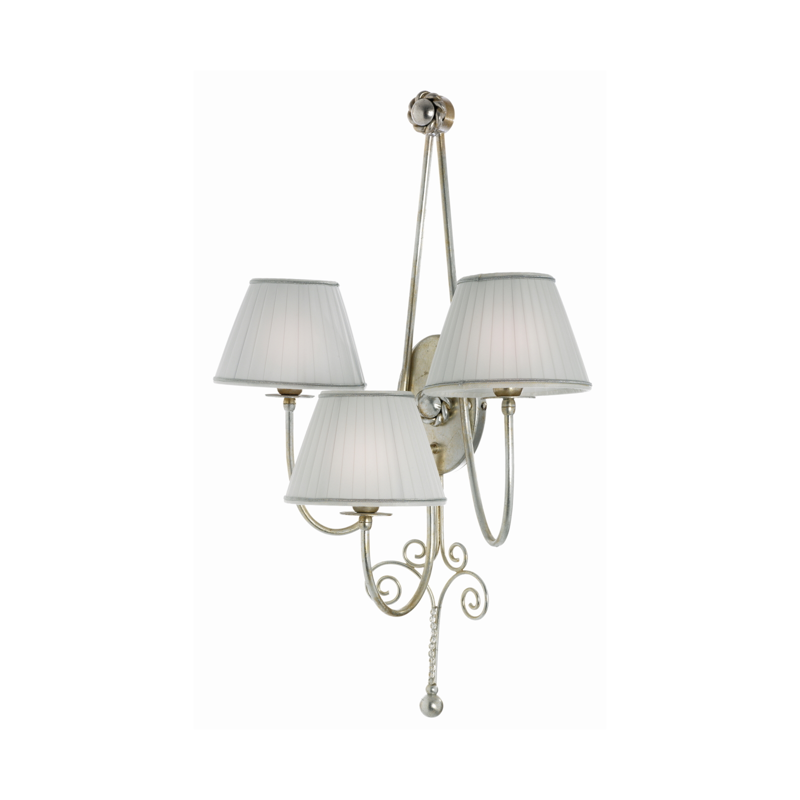 Perfectly suited for furnishing bedrooms, corridors and living areas, these items share a metal structure decorated with antiqued silver leaf. Specifically, this three-light wall model is proposed with three conical lampshades in white pleated fabric.