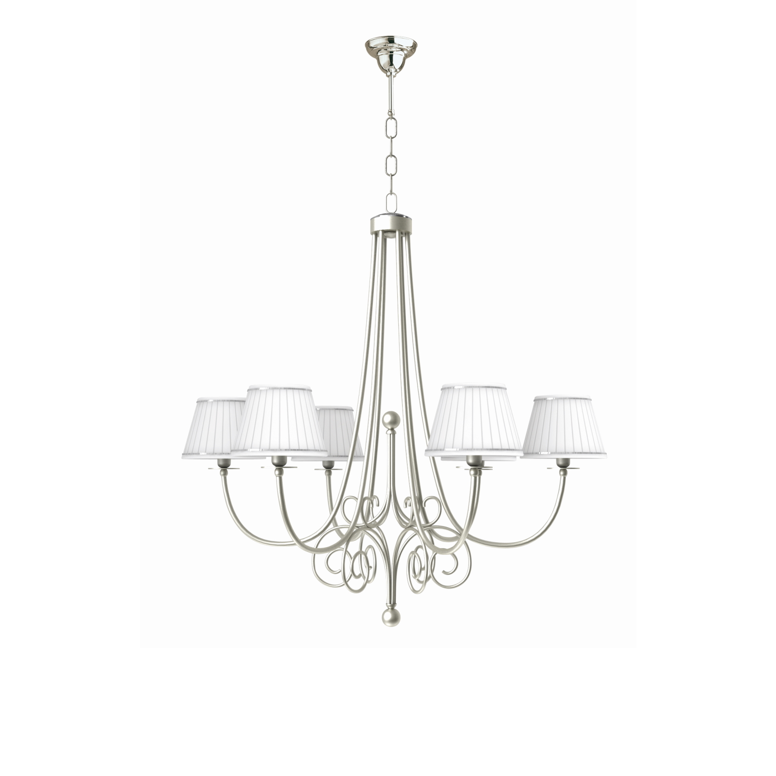 Perfectly suited for furnishing bedrooms, corridors and living areas, these items share a metal structure decorated with antiqued silver leaf. Specifically, this chandelier is proposed with six conical lampshades in white pleated fabric.