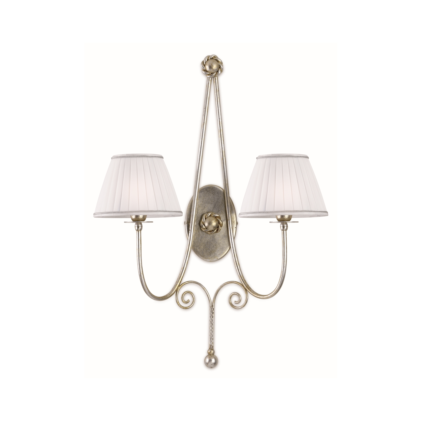 Perfectly suited for furnishing bedrooms, corridors and living areas, these items share a metal structure decorated with antiqued silver leaf. Specifically, this two-light wall model is proposed with two conical lampshades in white pleated fabric.