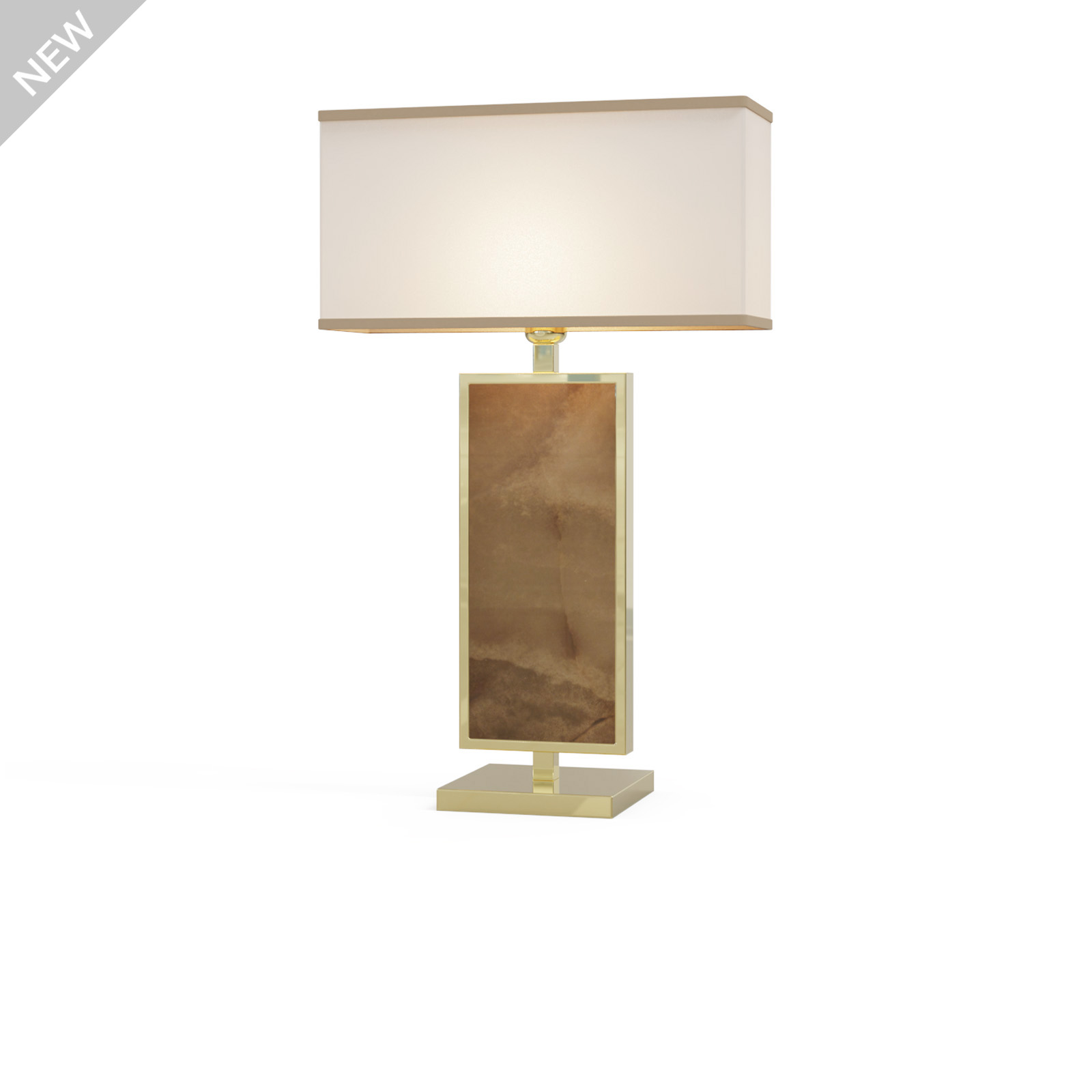 Designed with the aim of combining refinement and aesthetic beauty, these luminous bodies are a perfect match for rooms and common areas with a contemporary design. This table lamp model consists of a rectangular base in brass with stoneware details.