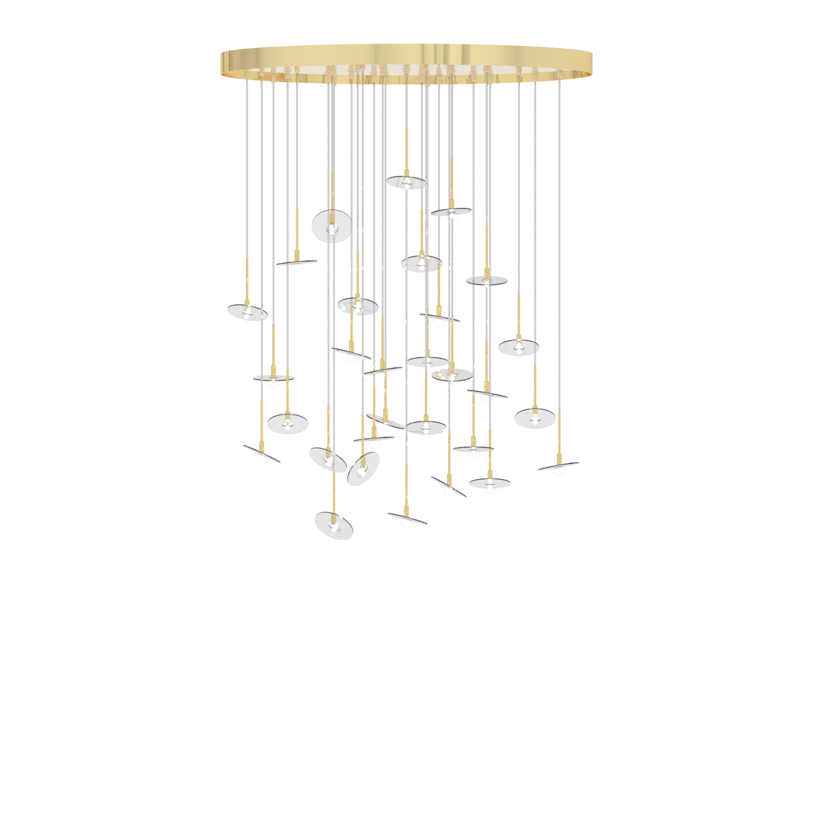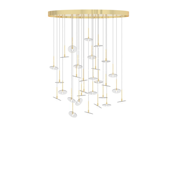 Inspired by a contemporary and sophisticated design, this chandelier ideal for living rooms and living areas is a clear example of aesthetic and practical functionality. Composed of an upper metal structure in the precious light gold finish and n. 30 suspended elements and adjustable transparent methacrylate details.