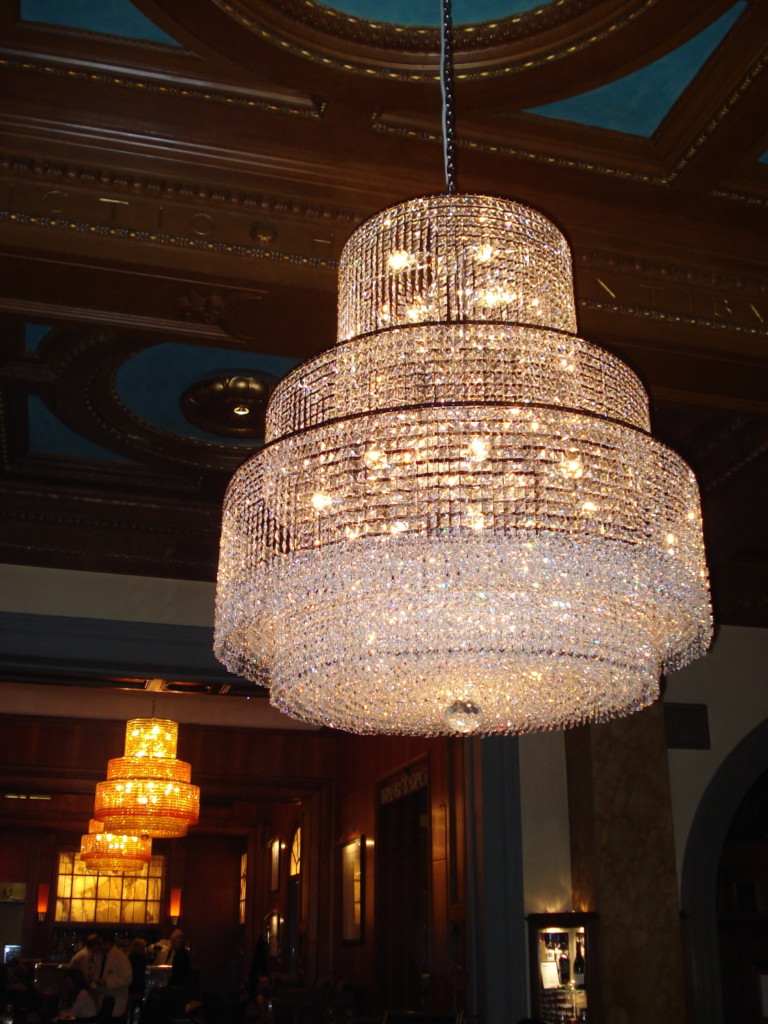 Ideal for lighting halls and large spaces, inside hotels, residences and resorts, this remarkable architecture, the result of a great design work, was made of brass with a polished nickel finish and completed with numerous crystal details.