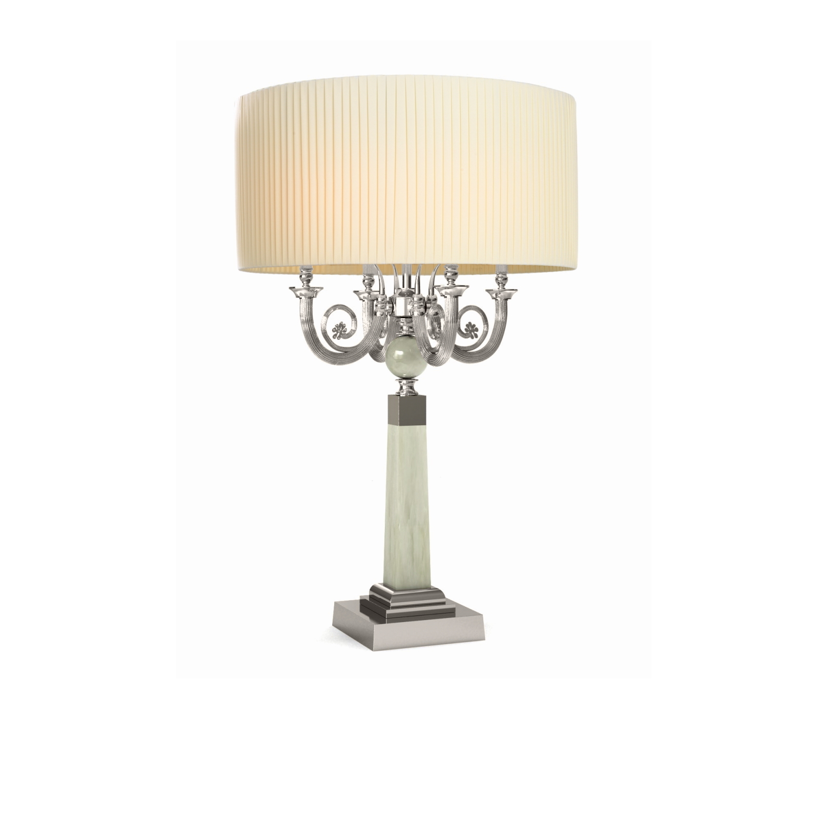 Available in various fabrics and finishes, this table model with 4 bulbs and light gold-finish brass structure features a cylindrical lampshade in off-white pleated fabric.