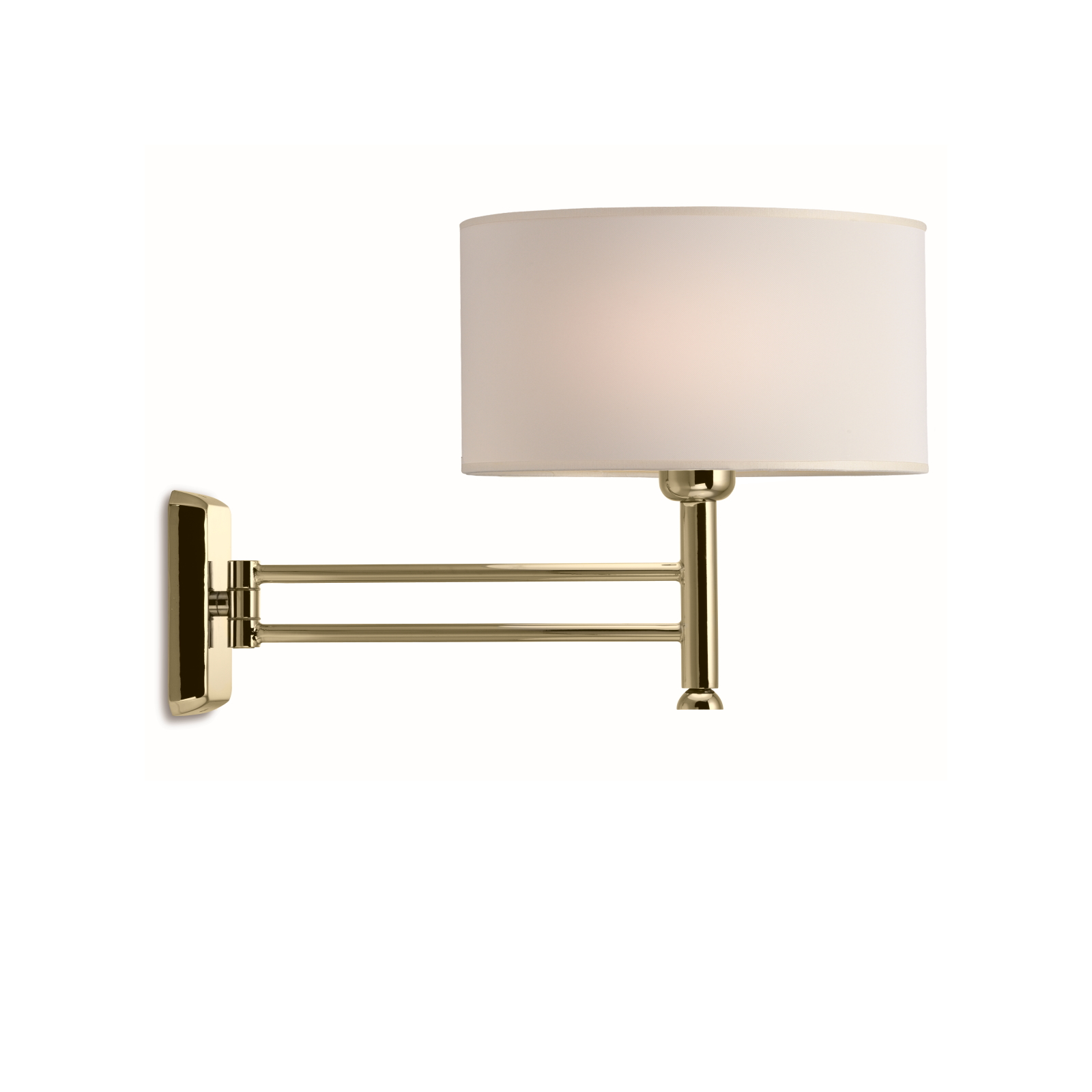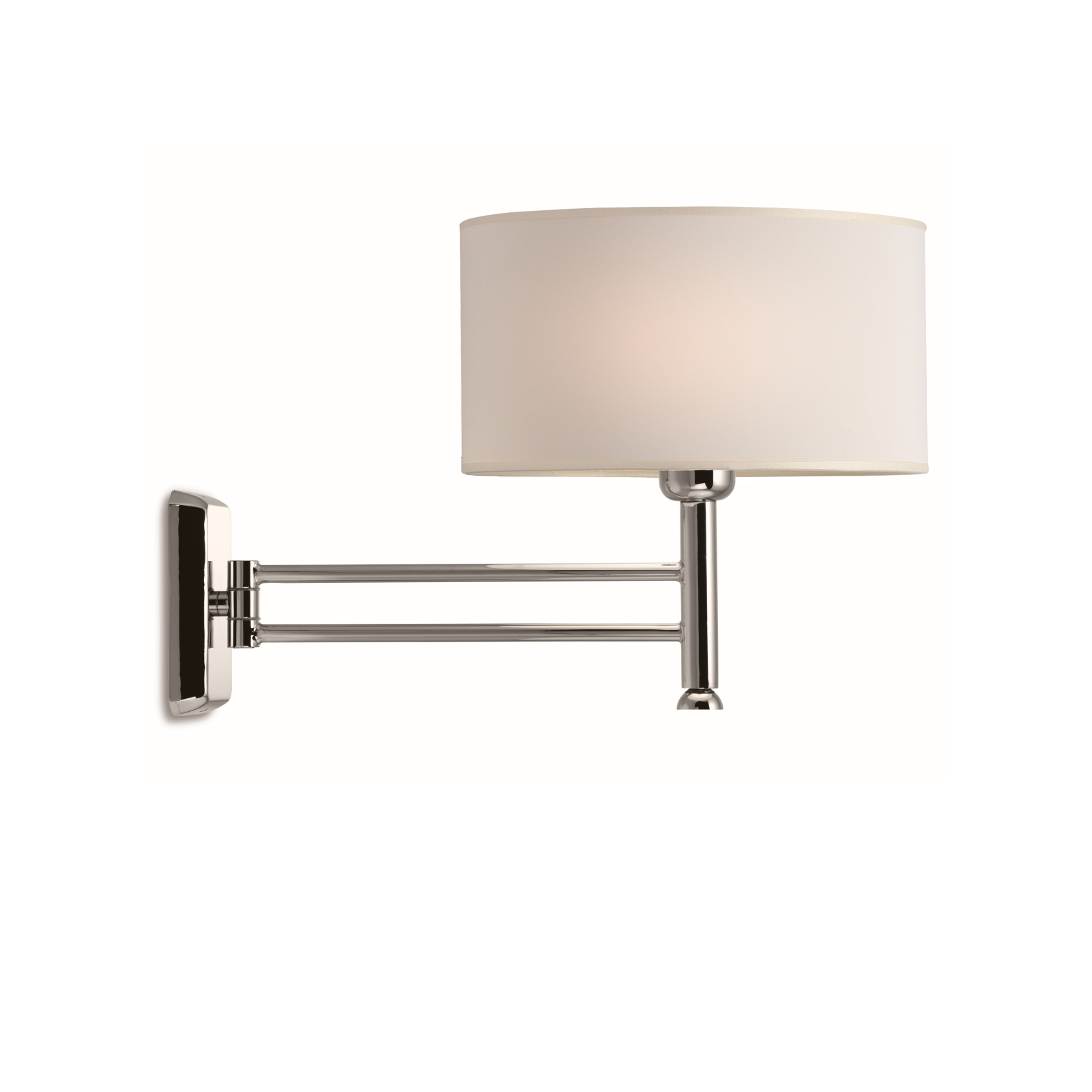 With its versatile character, this chrome-finish brass wall lamp consists of an articulated arm and a cylindrical shade in sand-colored fabric. Available in chrome, nickel and light gold finishes.