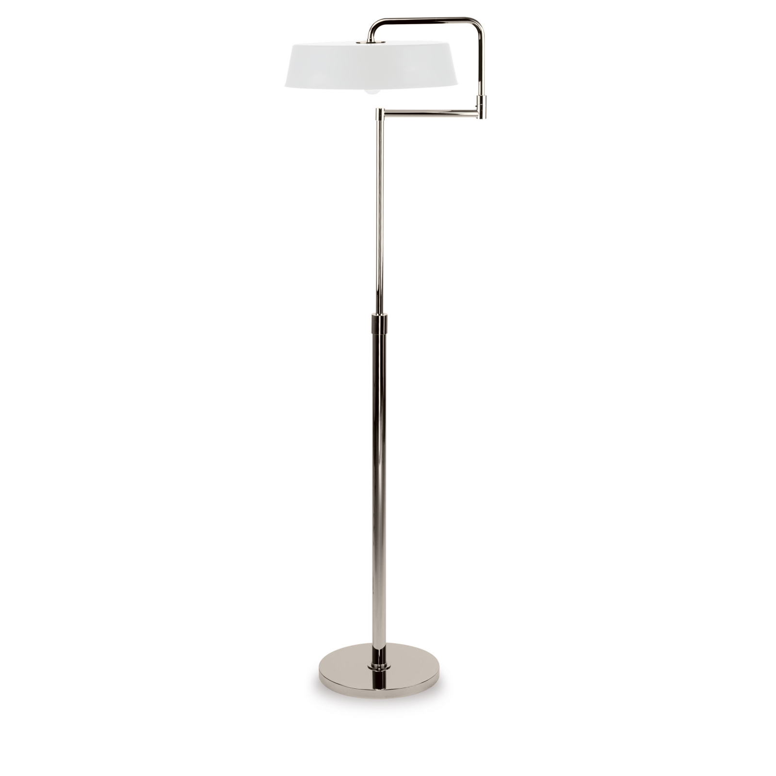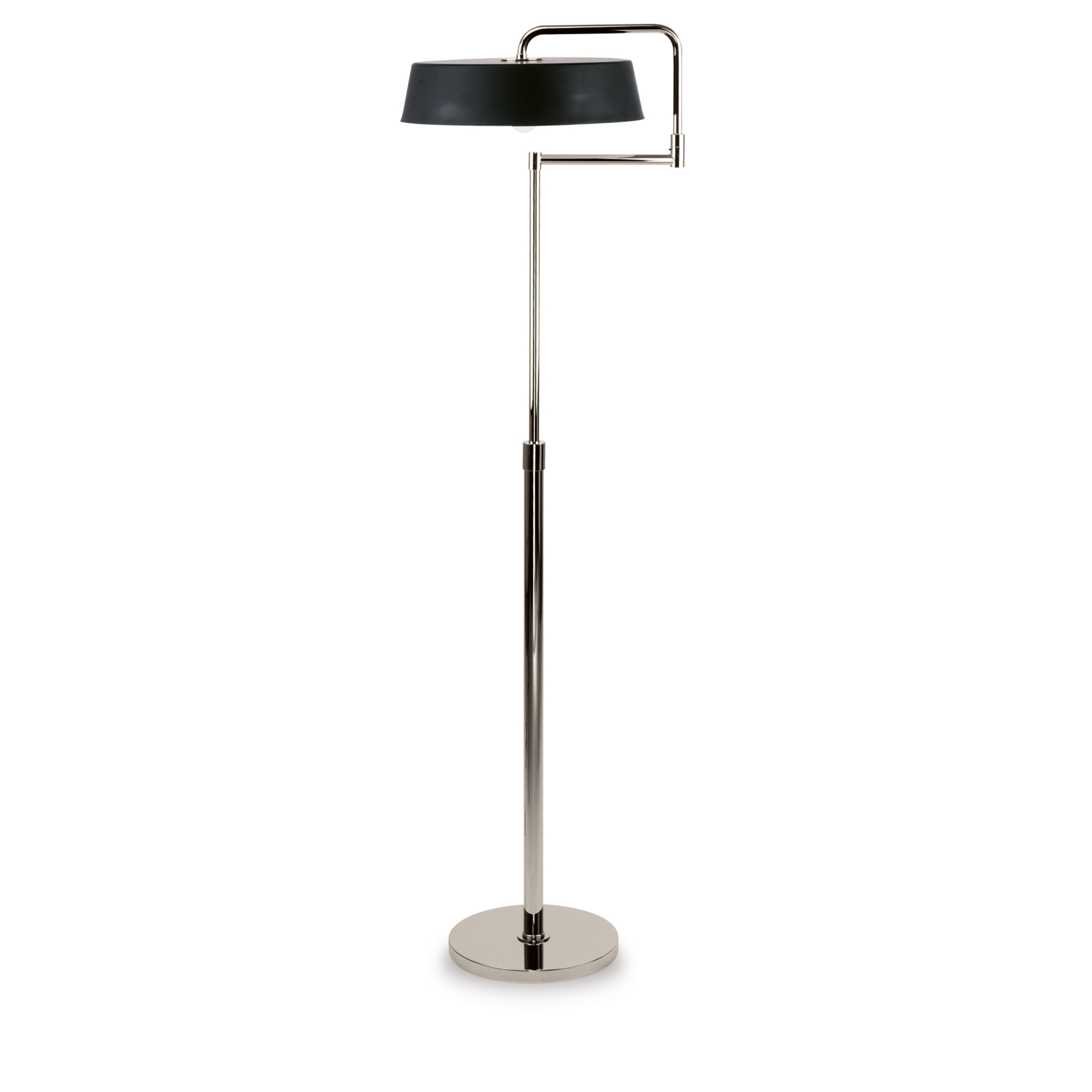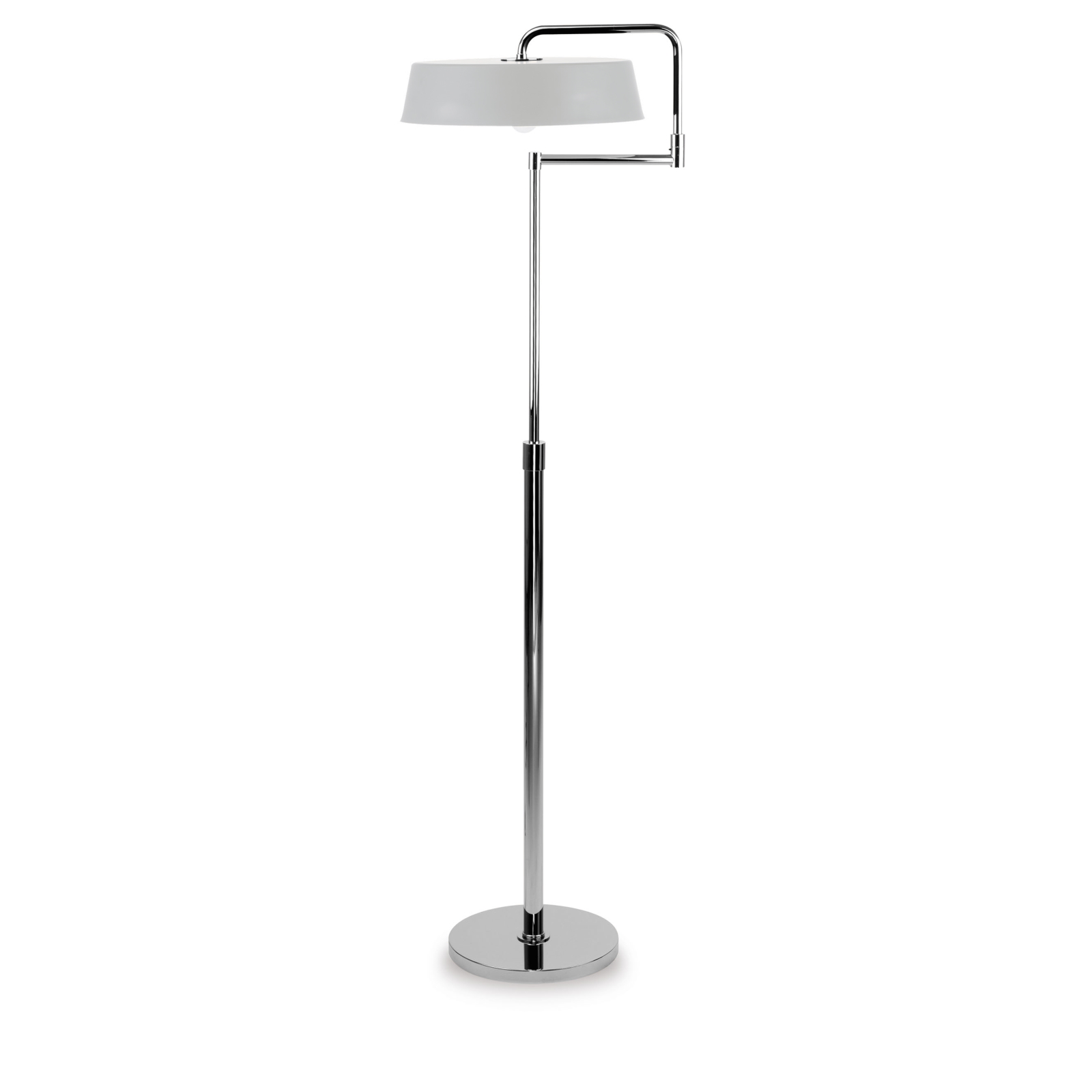 This adjustable floor lamp in chrome-plated brass has a truncated cone-shaped circular cap in two-tone painted metal as a lampshade. Available in various colors.
