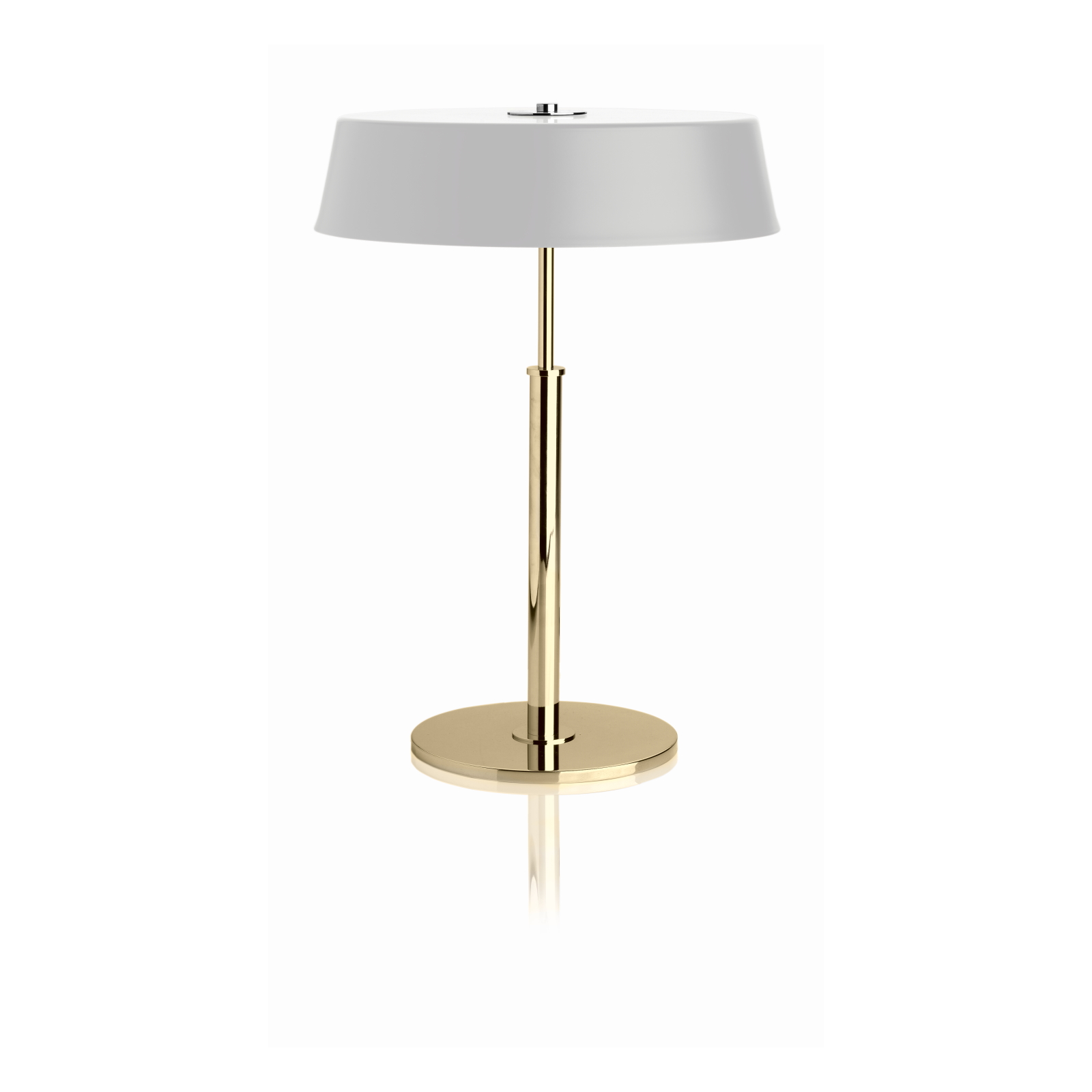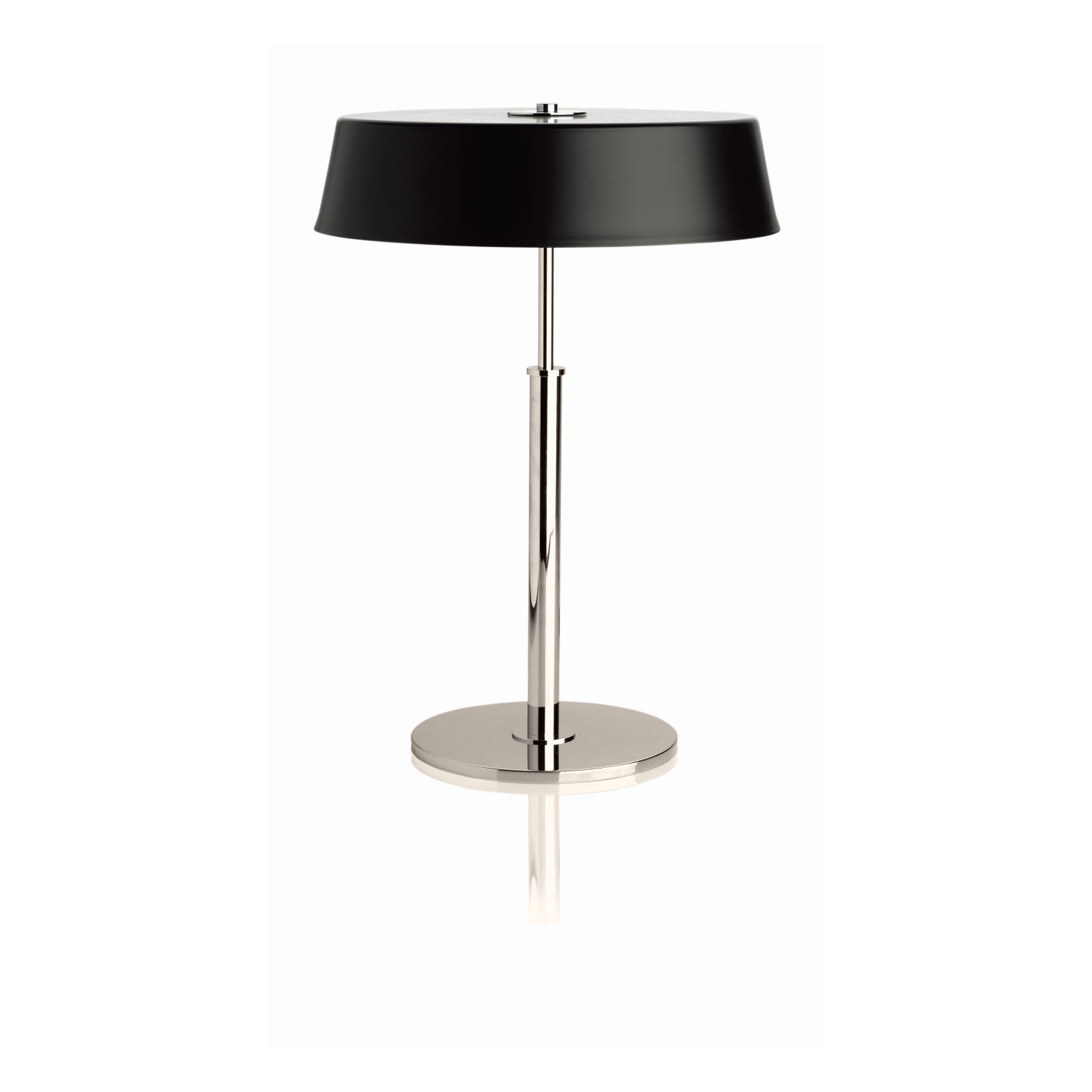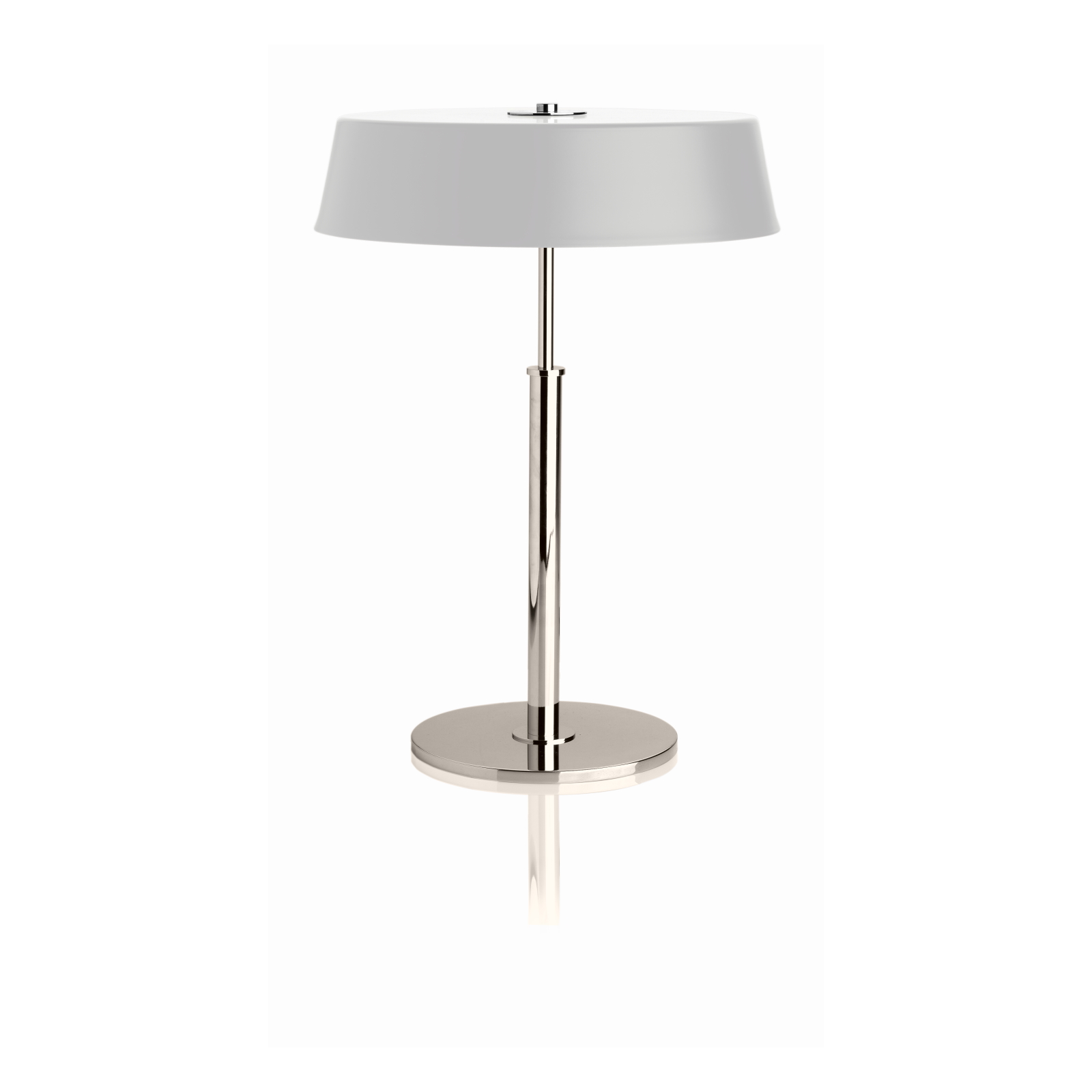 This chrome-finish brass table lamp has a truncated cone-shaped circular cap in two-tone painted metal as a lampshade. Available in various colors.