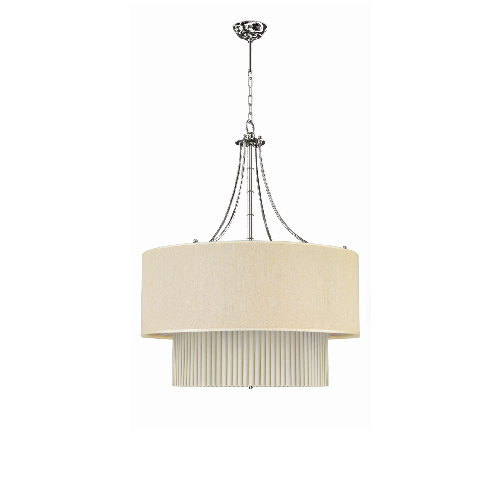 Perfect for diffusing a warm and welcoming light, this particular suspension made up of two concentric cylinders in ivory fabric, features brass details in a chrome finish.