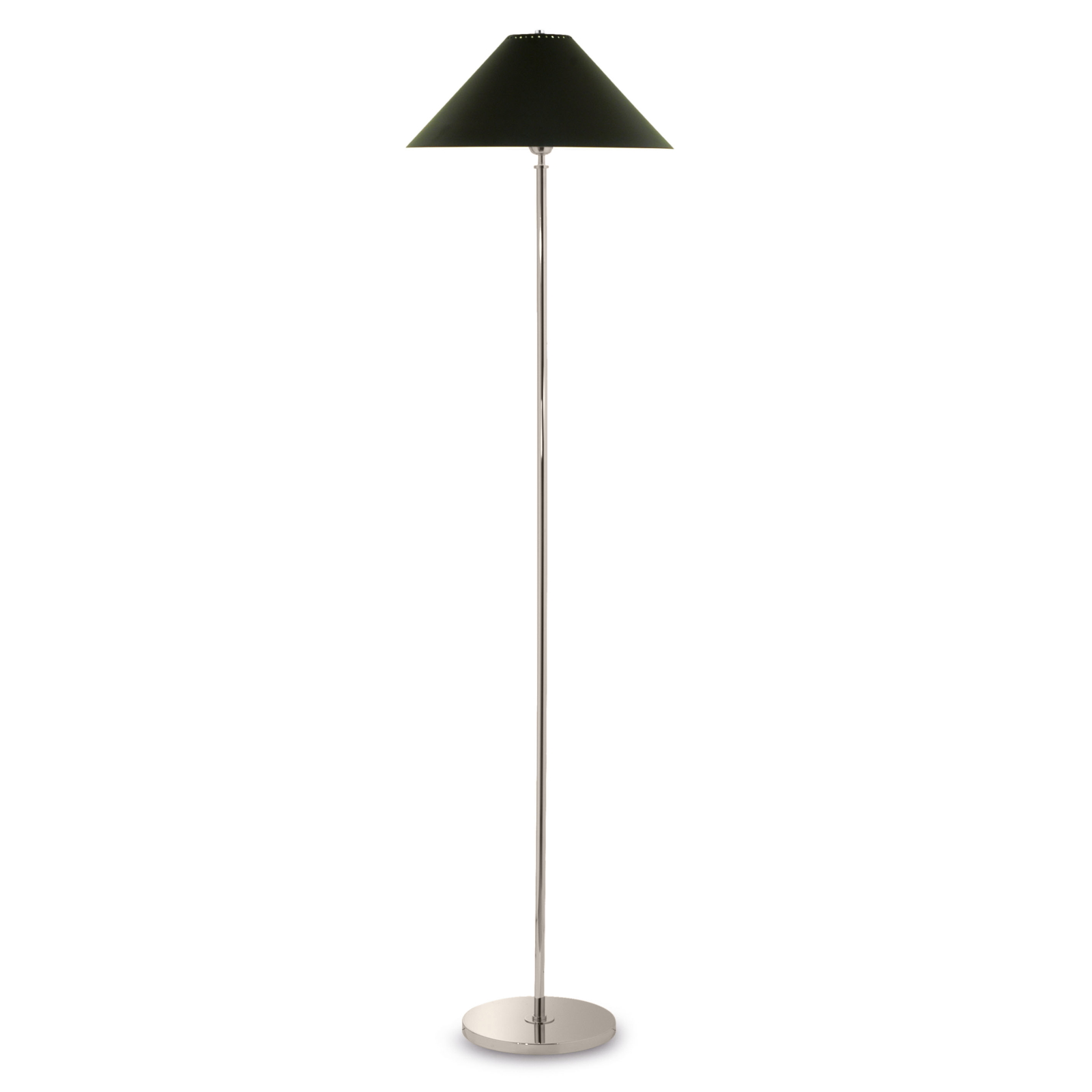 Made with a chrome finish brass structure and available in other finishes, this particular model features a conical shaped lampshade in two-tone painted metal.