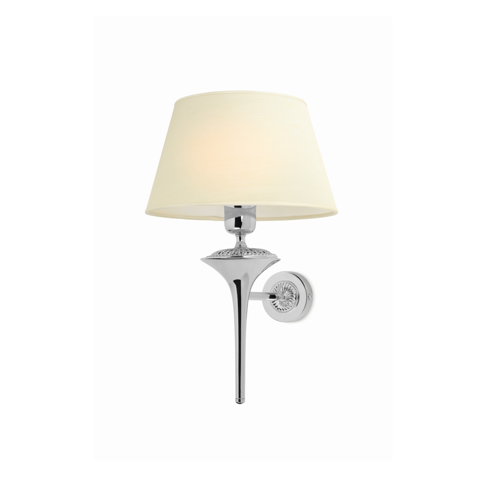 Formed by a vertical brass stem, the diameter of which shrinks downwards and by a conical lampshade in ivory fabric. This wall model in light gold finish is a perfect match for bedrooms, corridors and common areas.