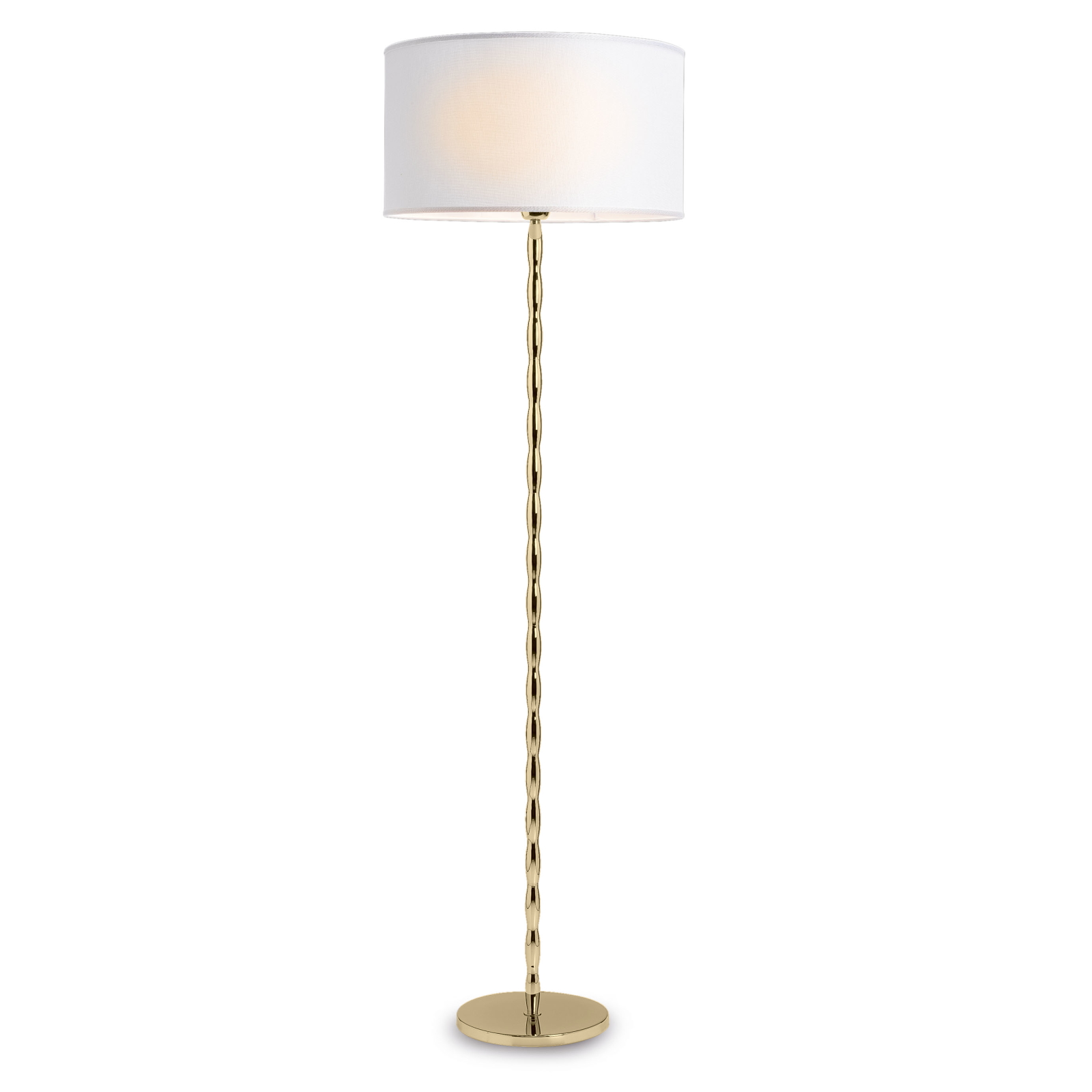 Thanks to its wavy and cyclic shapes, this chrome-finish metal floor lamp manages to create a relaxing and dynamic atmosphere. Equipped with cylindrical lampshade in white fabric. Available in various colors.