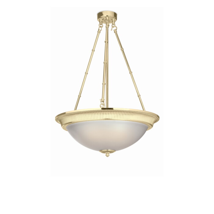 This model of chandelier is made of brass in a light gold finish and completed by a satin glass.