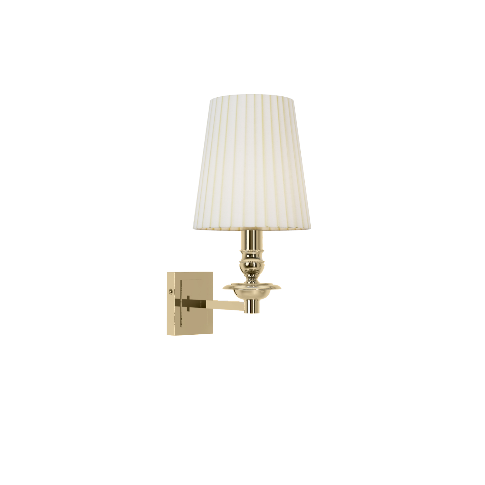 Perfect for creating an environment with elegant and refined atmospheres. This wall item, with a brass structure in a polished nickel finish, features a conical lampshade in ivory pleated fabric.