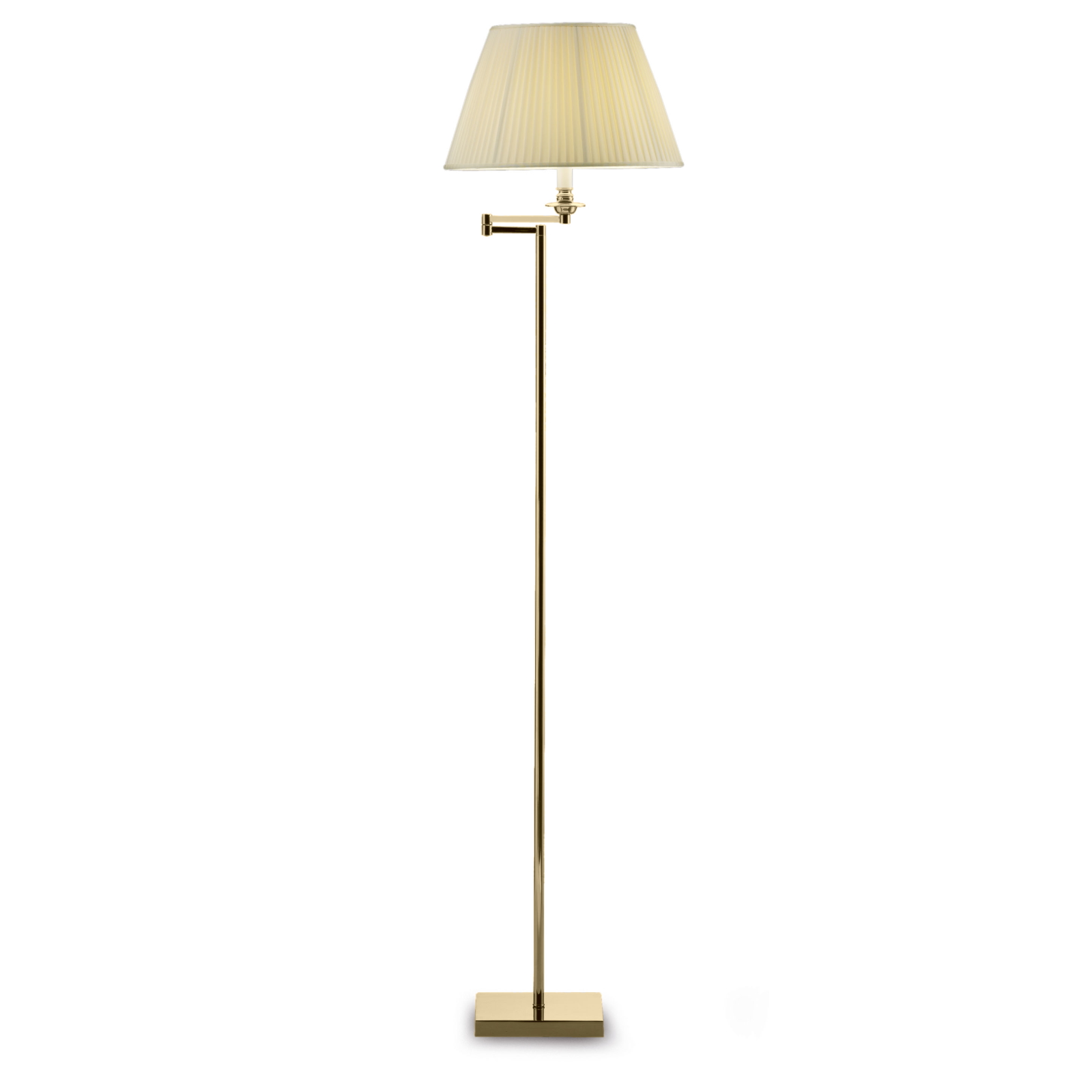 This floor lamp with adjustable arm in brass, has a double joint in polished nickel finish, and a conical lampshade in ivory pleated fabric.
