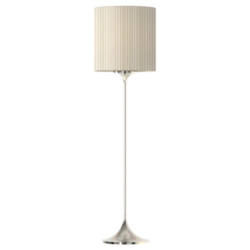 An essential light element for bedrooms and common areas, it has a metal structure with a polished nickel finish, a round base and a cylindrical lampshade in ivory pleated fabric.