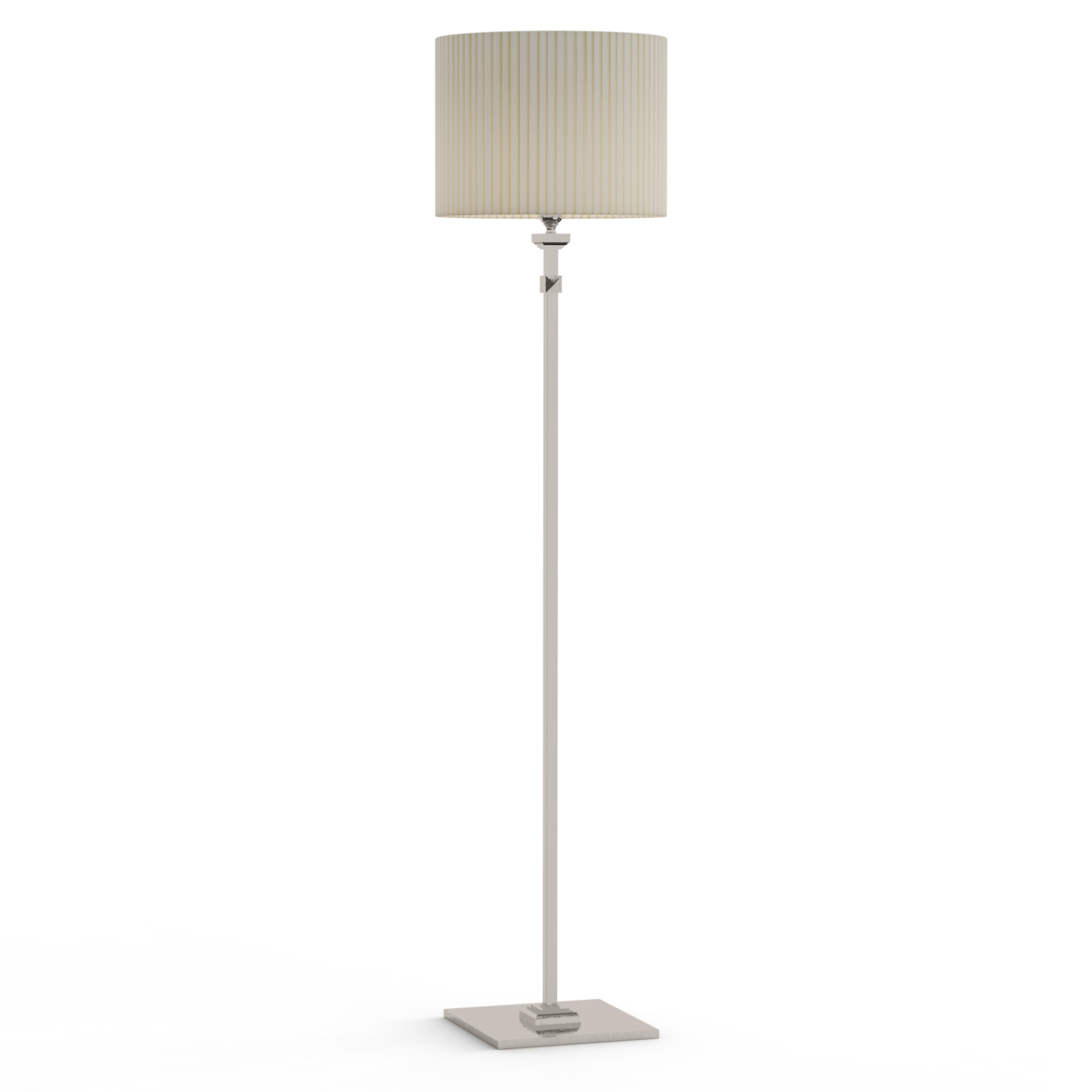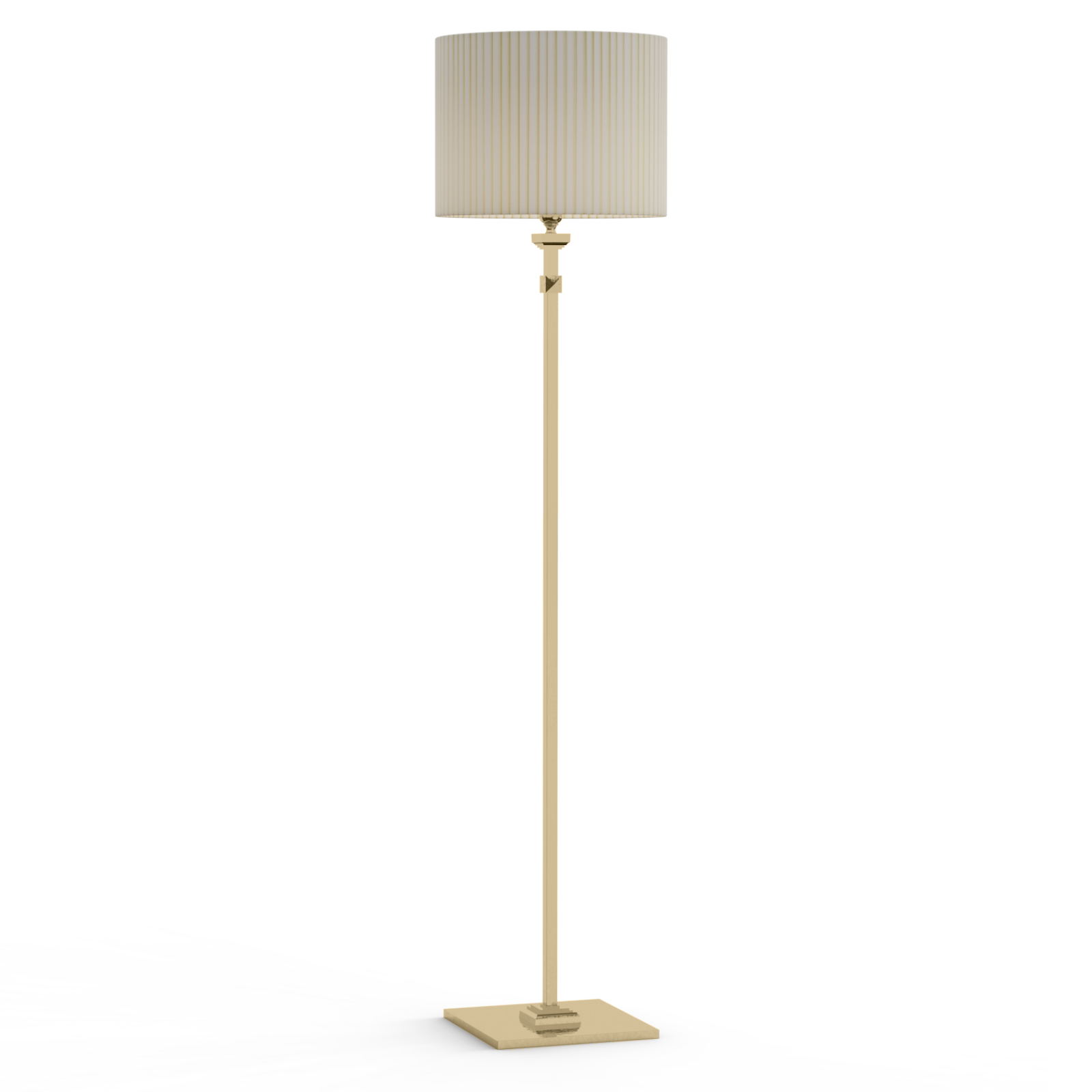 Equipped with a square base, the floor model in brass with a polished chrome finish has a cylindrical lampshade in ivory pleated fabric. Ideal for lighting bedrooms and living areas.