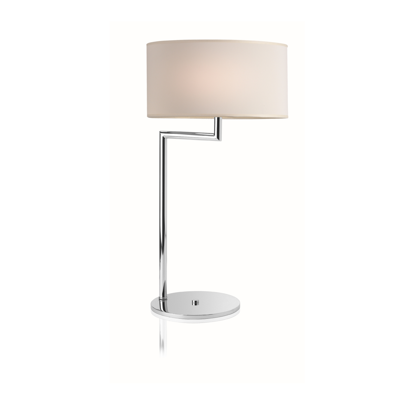 Straight lines broken by right angles make them a perfect match for modern interiors characterized by regular geometries. This table model is offered in chrome-finish brass and a cylindrical lampshade in white fabric.