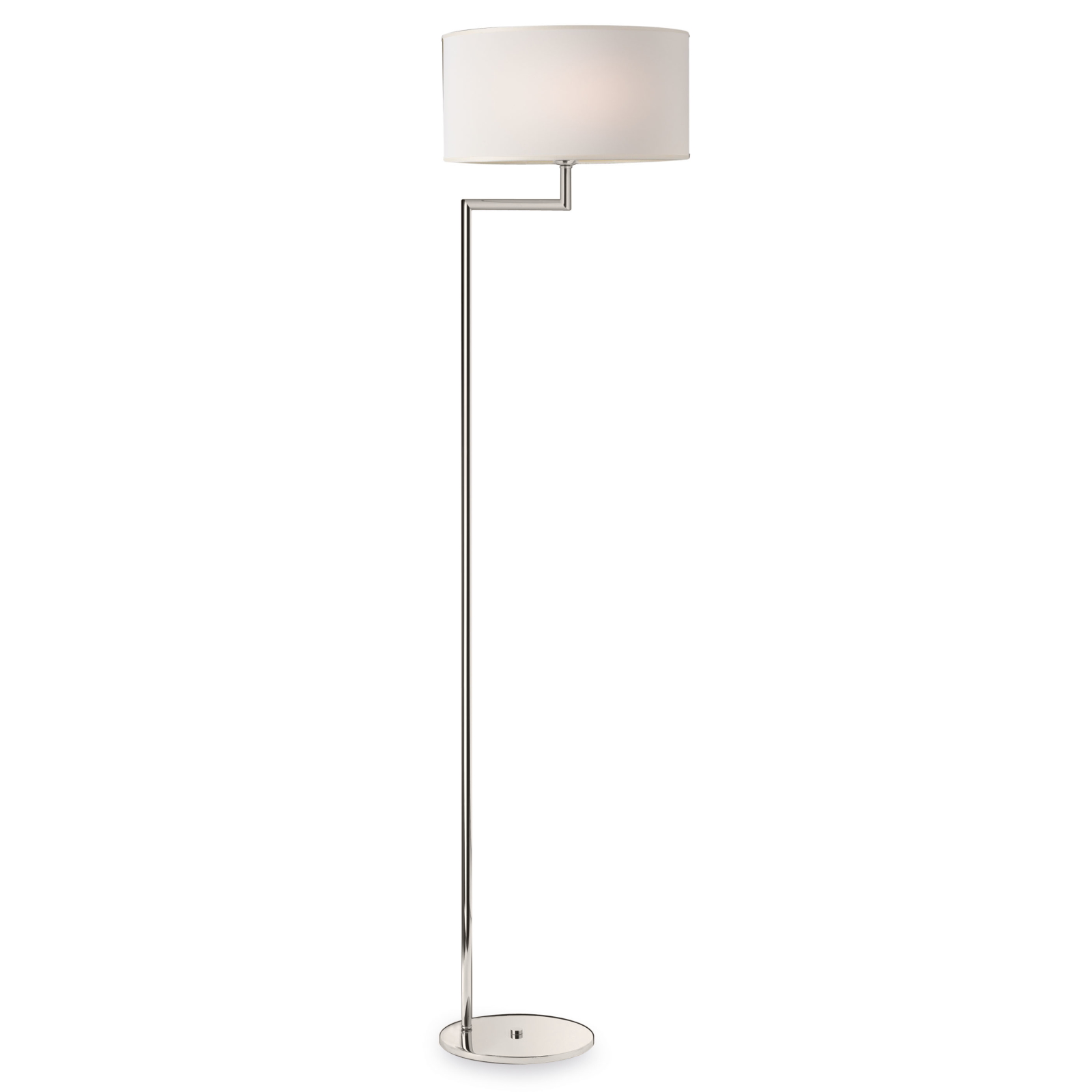 Straight lines broken by right angles make them a perfect match for modern interiors characterized by regular geometries. This floor model is available in chrome-plated brass and a cylindrical lampshade in white fabric.