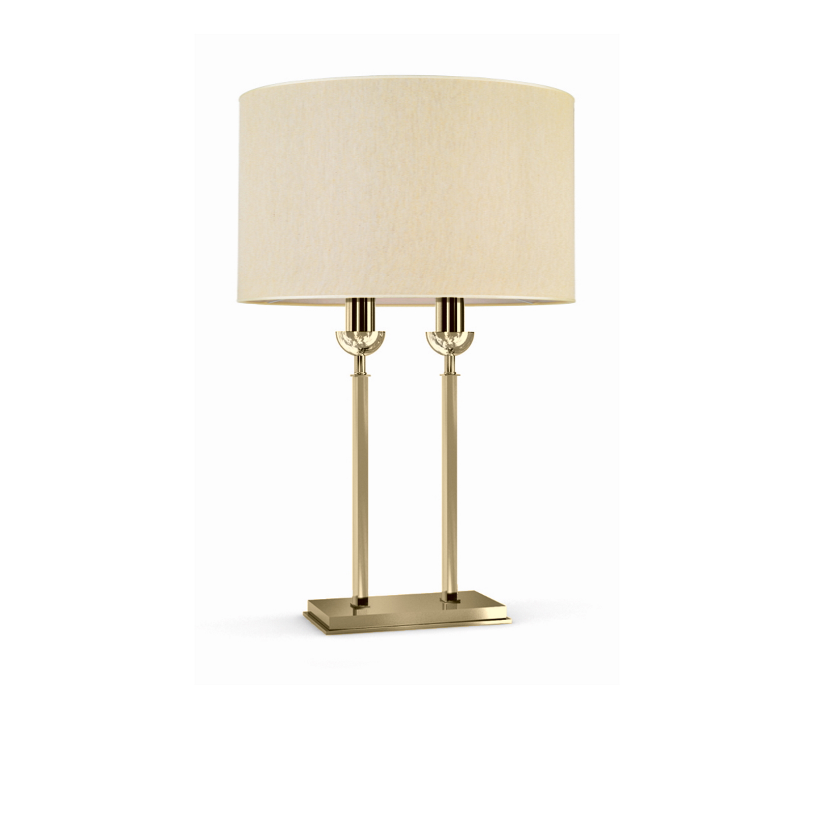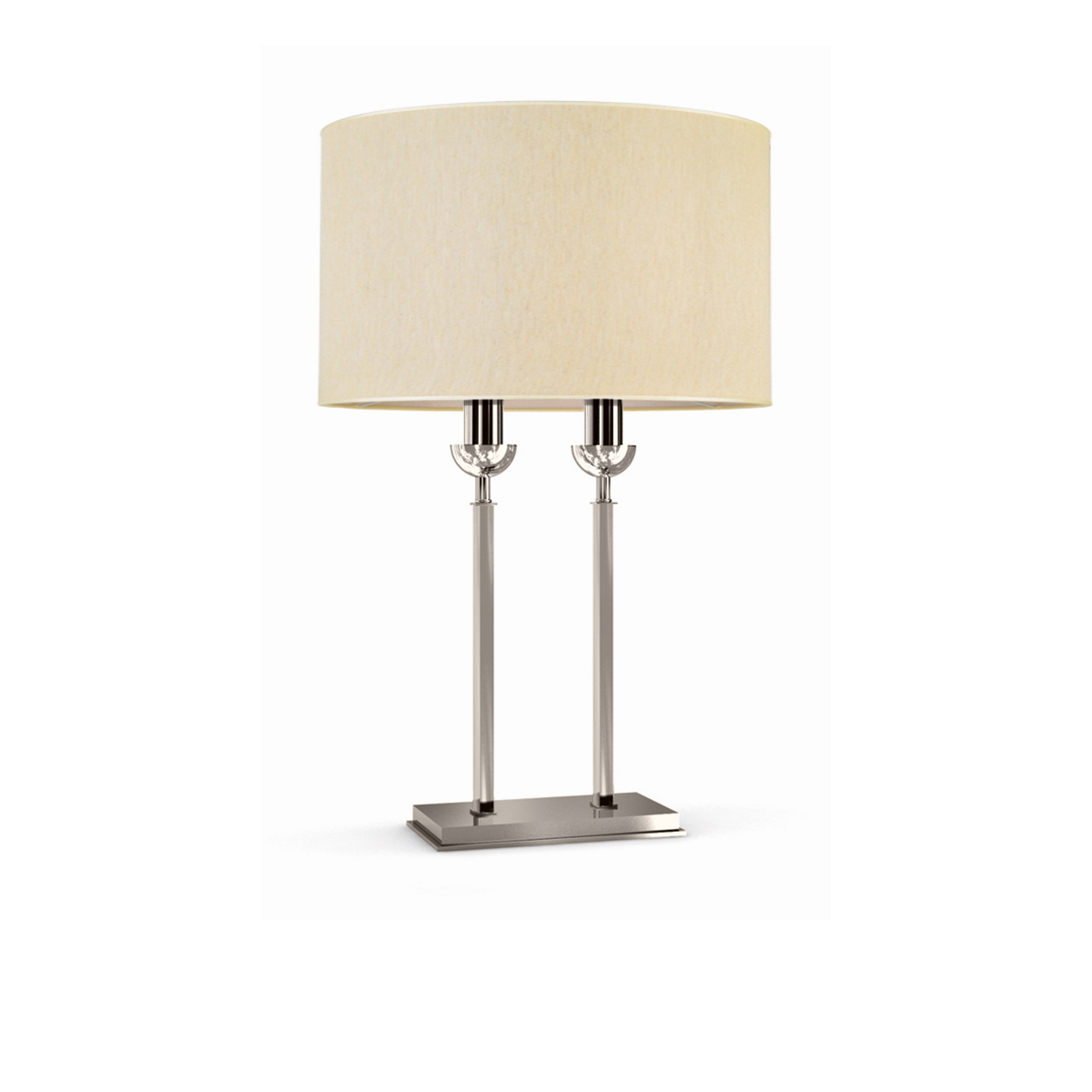 The bedside or table lamp model, with two light points, has a brass structure composed of a rectangular base and two stems in a chrome finish, surmounted by a cylindrical lampshade in ivory fabric. Available in various finishes.