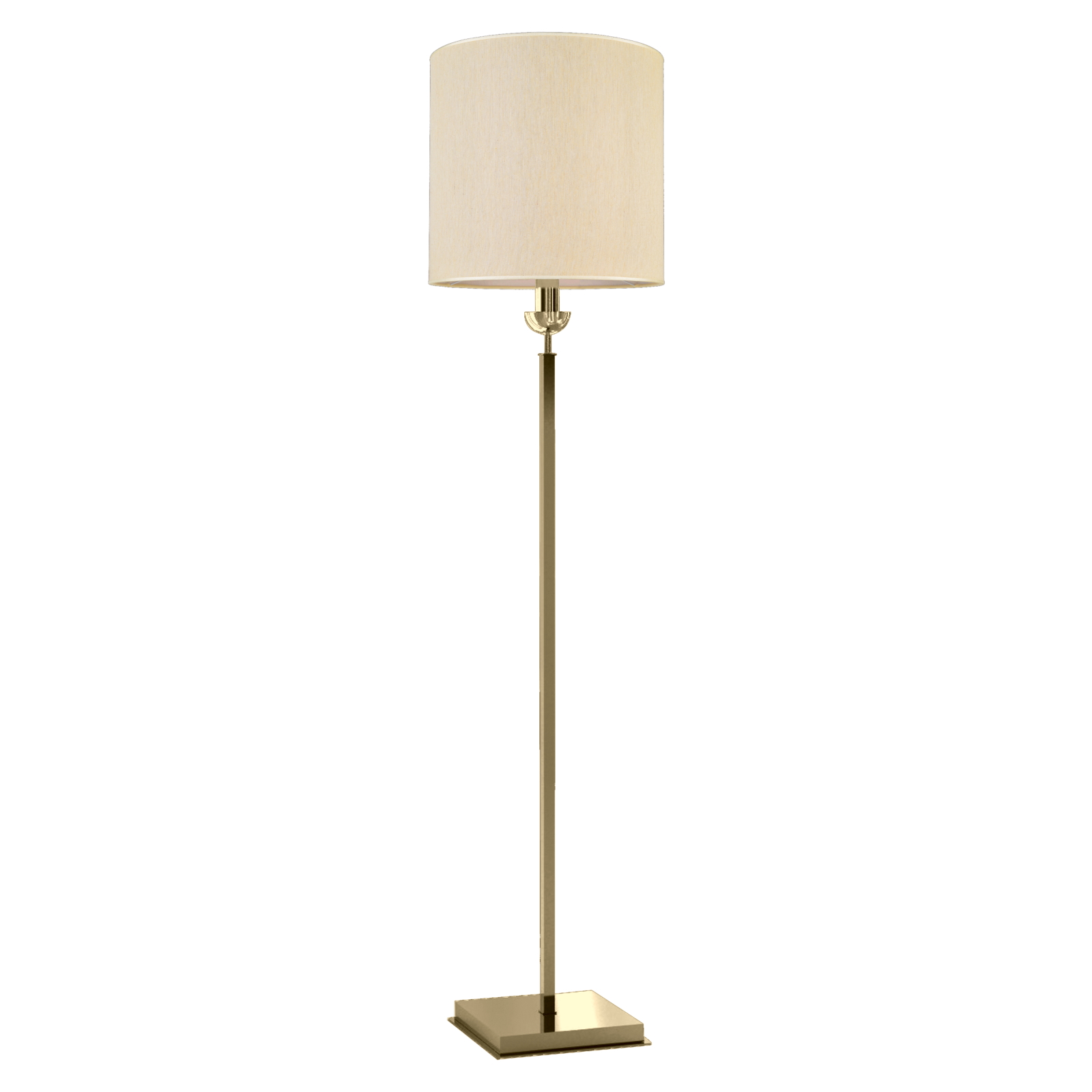 The floor lamp model has a brass structure in a chrome finish and a cylindrical lampshade in ivory fabric. Available in various finishes.
