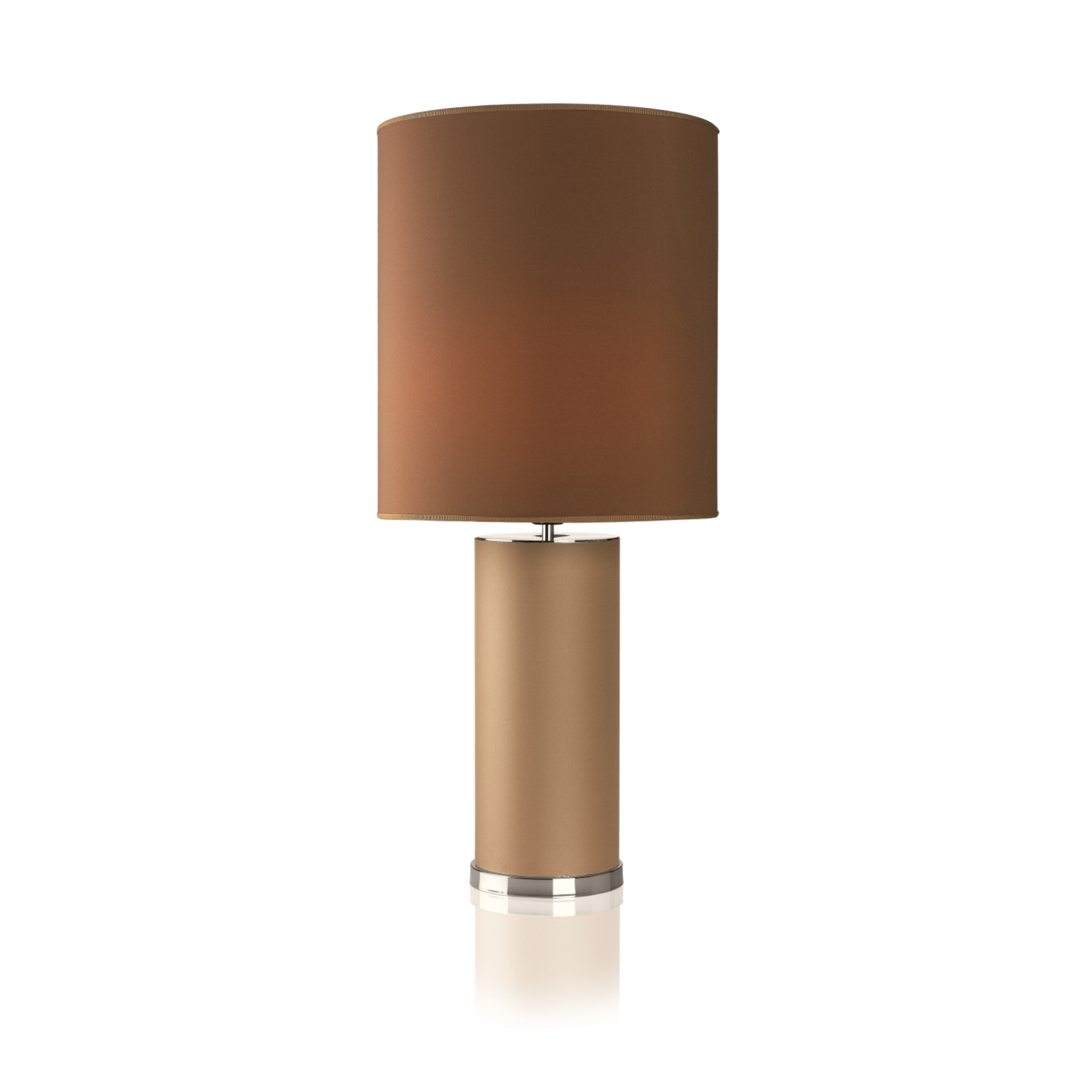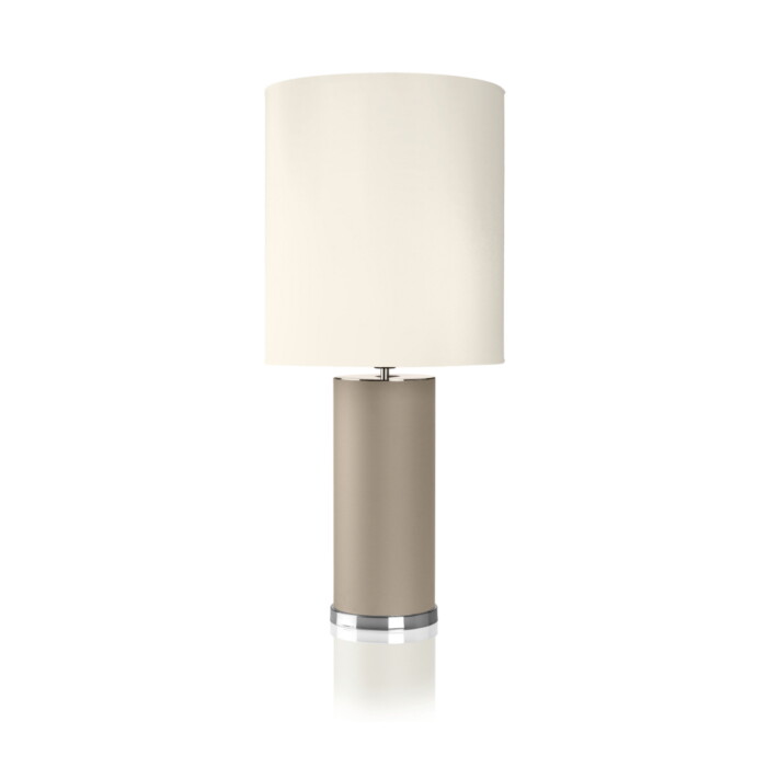 A cylindrical central body in metal covered in fabric with chromed details meets a cylindrical lampshade in ivory fabric.