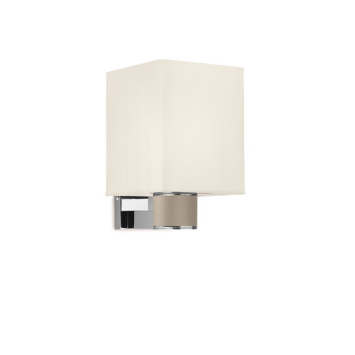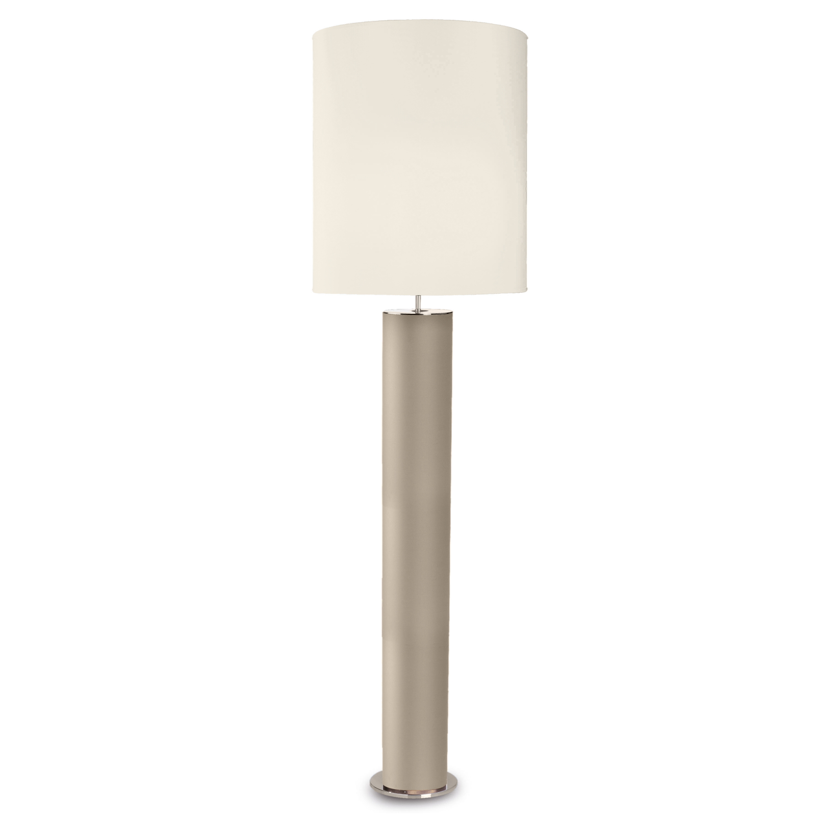 A cylindrical central body in metal covered in fabric with chromed details meets a cylindrical lampshade in ivory fabric.