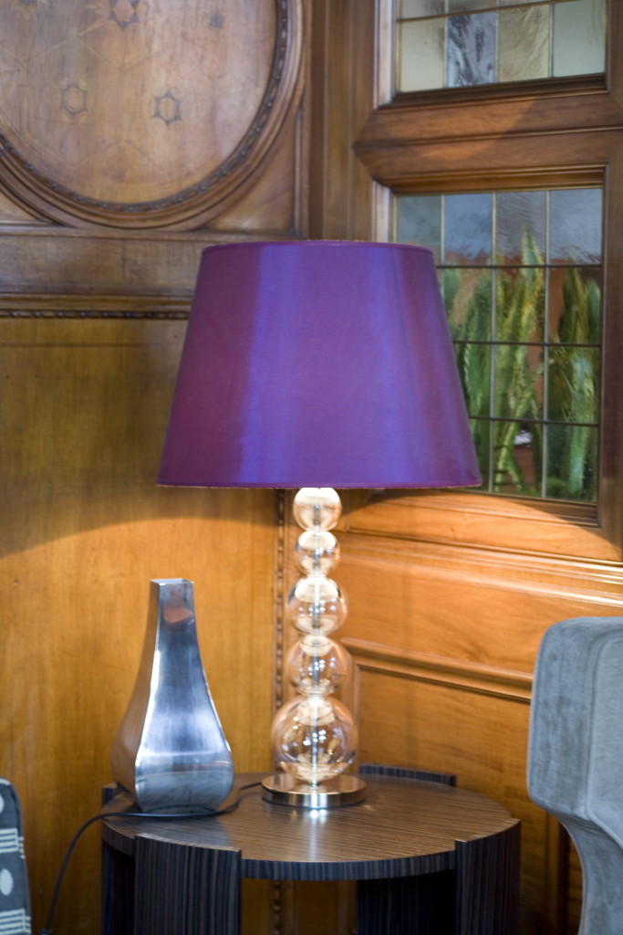 Consisting of a central body with crystal spheres and details in polished nickel finish. Conical lampshade in red fabric.
